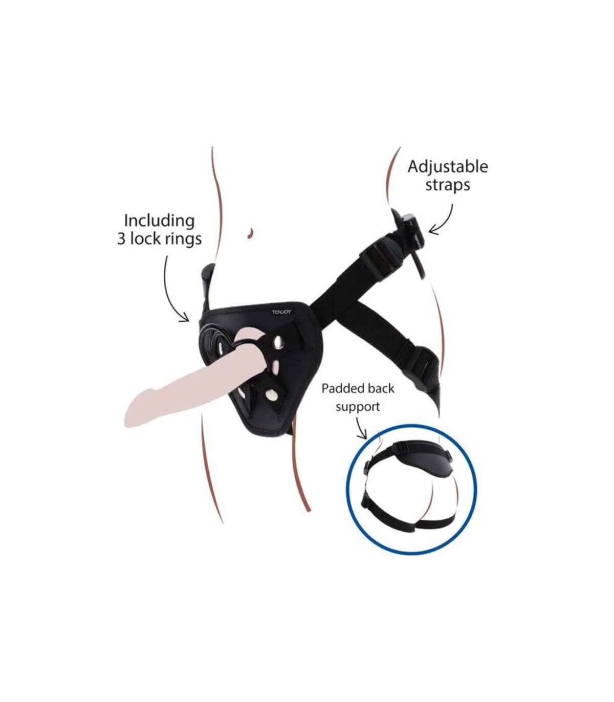 La parte delantera está diseñada con cierres ajustables. Incluye 3 anillos de silicona 3,5 & 4,5 y 5 cm que te permiten usar tu dildo favorito.