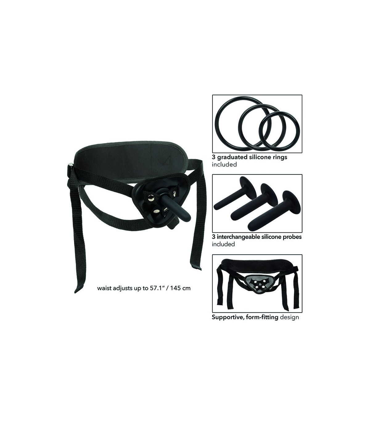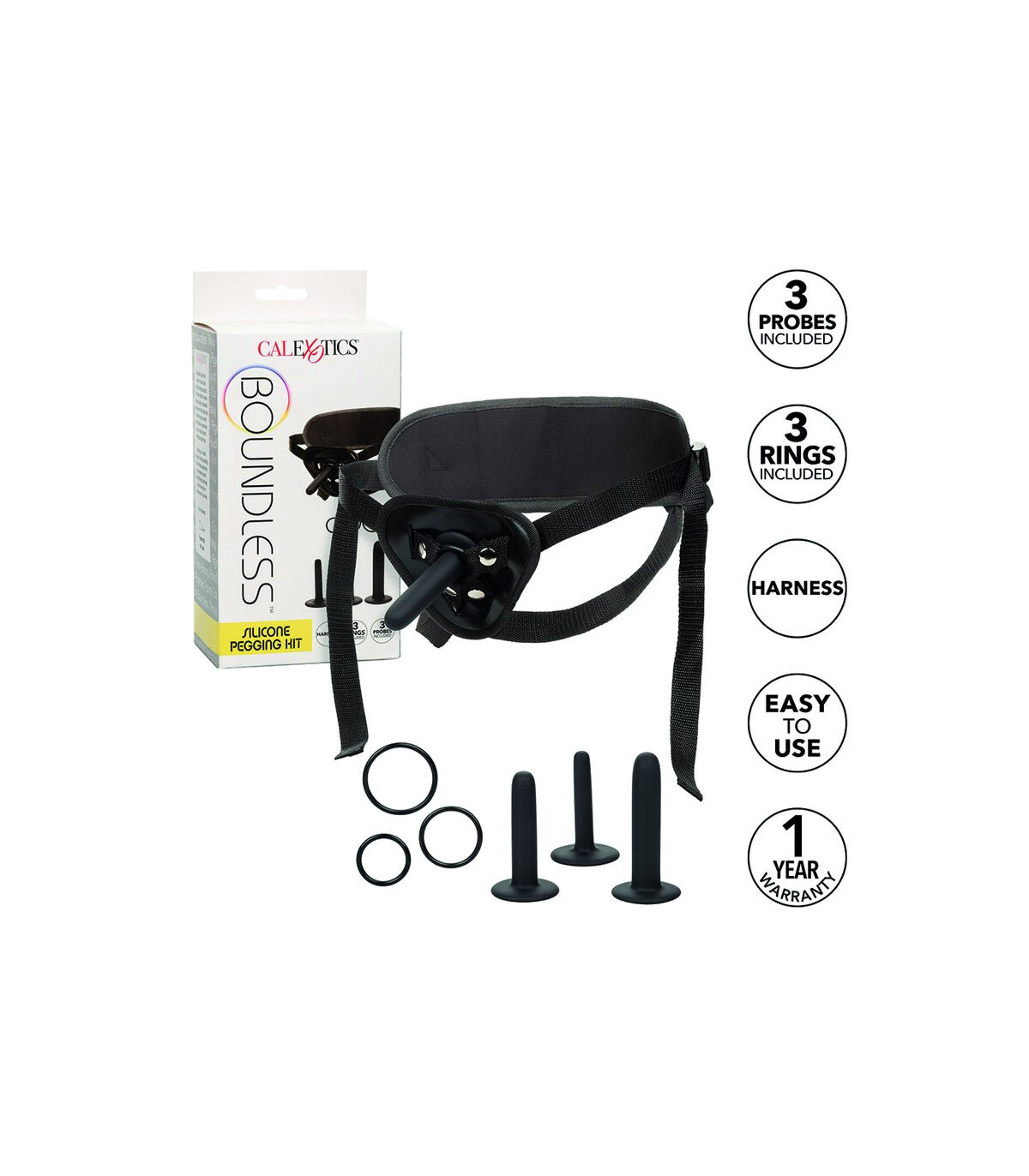 El kit de clavijas de silicona Boundless está hecho para sumergirte en el emocionante mundo del placer infinitamente satisfactorio. Este set de placer anal está hecho para jugar con 3 tamaños graduados de sondas de pegging, un arnés universal y 3 tamaños graduados de anillos de soporte. Las sensuales sondas de silicona están hechas para aumentar el placer con 3 tamaños graduados para facilitarle la emoción de las pasiones de la puerta trasera. Cambie fácilmente el tamaño de la sonda con el juego de 3 anillos de arnés intercambiables para acomodar cualquier dong, consolador o juguete de arnés Boundless. Mantente cómodo incluso durante el juego de placer más vigoroso con el ajuste universal, las correas totalmente ajustables para los muslos y la cintura, y la banda trasera de apoyo. Abraza el juego desinhibido, el placer desenfrenado y deja volar tus fantasías con este juego de arnés y sonda.