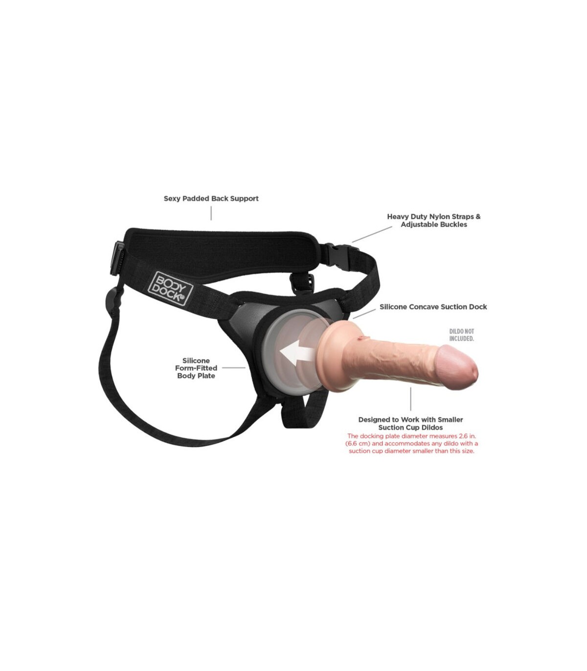 ¡El Body Dock Elite Mini patentado lleva el juego con arnés a un nivel completamente nuevo! Cuenta con una placa de acoplamiento de silicona premium que se adapta a la forma de tu cuerpo, hebillas ajustables de liberación lateral y soporte acolchado para la espalda. El Elite Mini fue diseñado específicamente para dildos con ventosas más pequeñas, ofreciendo un ajuste más pequeño. ¡Cambiar tu accesorio favorito de arnés nunca ha sido tan rápido o fácil! Es tan simple como adjuntar la ventosa de tu dildo o vibrador favorito a la placa de acoplamiento, mientras que las correas de nylon se ajustan fácilmente a la mayoría de tallas y tipos de cuerpo. Y lo mejor de todo es que funciona con la mayoría de los dildos disponibles en el mercado hoy en día, incluidos algunos que ya puedas tener. ¡Sin anillos. Sin broches. Sin complicaciones!