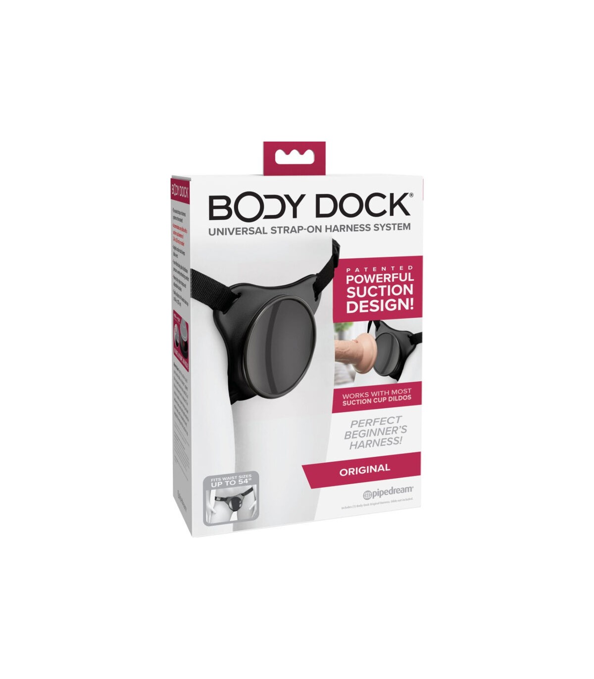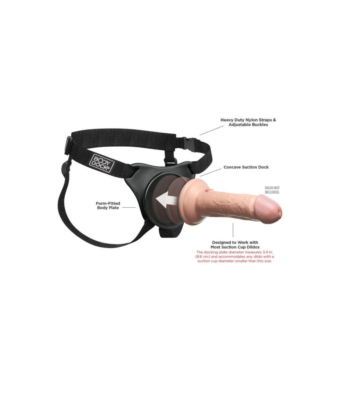 El patentado Sistema de Arnés Universal Body Dock lleva el juego con arnés a un nivel completamente nuevo! Es tan simple como adjuntar la ventosa a su dildo o vibrador favorito en la placa de acoplamiento, mientras que las correas de nylon se ajustan fácilmente a la mayoría de tamaños y tipos de cuerpo. ¡Sin anillos. Sin broches. ¡Sin problemas! Lo mejor de todo es que funciona con la mayoría de los dildos disponibles en el mercado hoy en día, incluidos algunos que quizás ya tenga. ¡Cambiar su accesorio de arnés favorito nunca ha sido más rápido o fácil!
