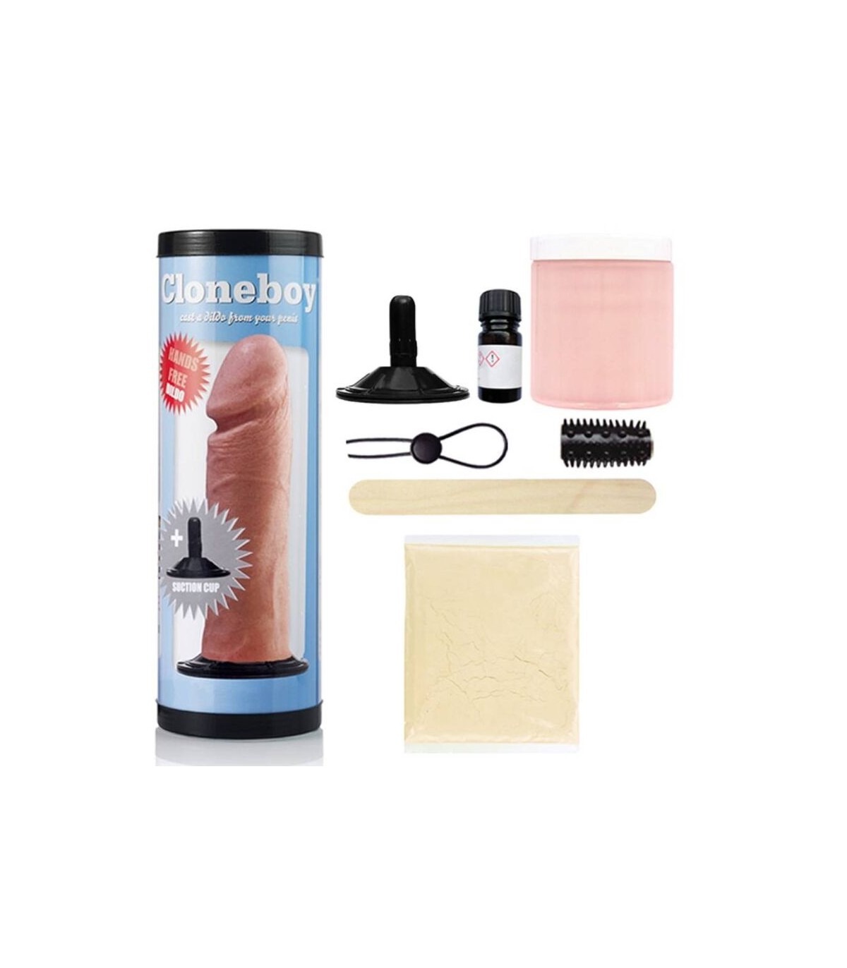 El kit de succión Cloneboy Cast Your Own Dildo contiene todos los elementos necesarios para hacer una copia de caucho de silicona de su pene, ya sea solo o junto con su pareja. El Cloneboy no contiene yeso que pueda irritar la piel y utiliza un material de moldeo probado médicamente hecho de algas naturales.