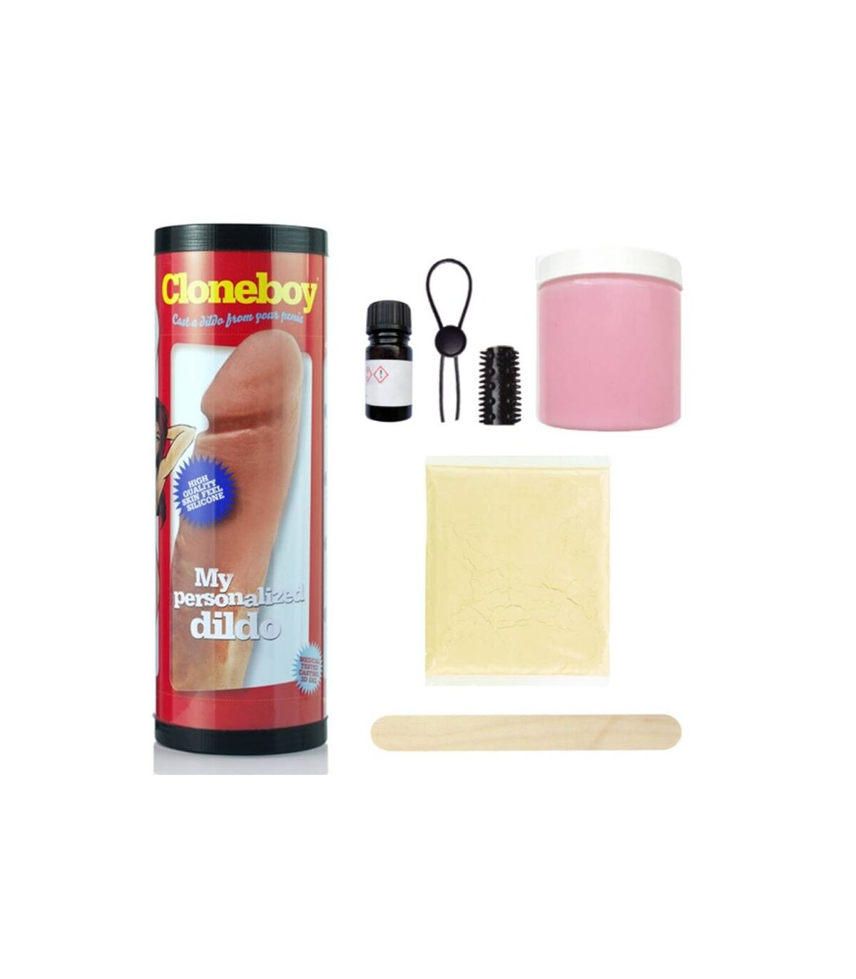 El kit Cloneboy Cast Your Own Dildo contiene todos los elementos necesarios para hacer una copia de caucho de silicona de su pene, ya sea solo o junto con su pareja. El Cloneboy no contiene yeso que pueda irritar la piel y utiliza un material de moldeo probado médicamente hecho de algas naturales.