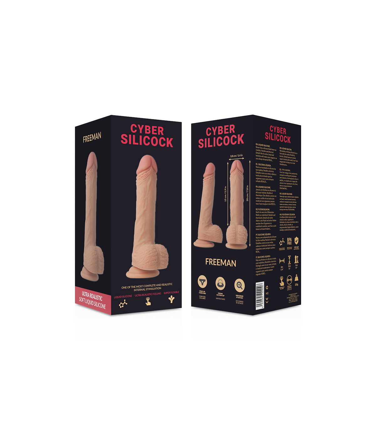 La forma natural y la composición del material cybersilicock hacen que este dildo realístico parezca particularmente real. Su forma recta, que termina en un glande definido con precisión, y la auténtica base de los testículos lo miman de manera embriagadora y sensual. Si prefiere que la mimen por vía vaginal o anal depende totalmente de usted. Ambos son fácilmente posibles con Freeman. La ventosa ancha es estable en superficies lisas y, por lo tanto, el consolador también es adecuado para aventuras desenfrenadas en la ducha y el baño, solos o juntos.