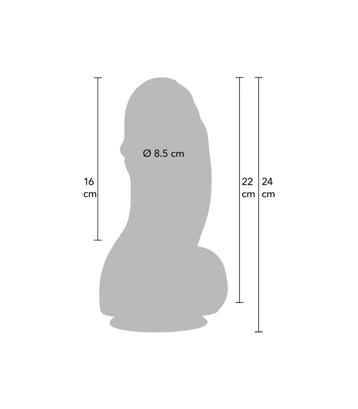 Fabricado con materiales de alta calidad y seguros para el cuerpo, este dildo es robusto pero mantiene una textura que permite un uso confortable dentro de su categoría de gran tamaño. Su acabado liso permite un deslizamiento suave, especialmente cuando se combina con lubricantes a base de agua. Además, su diseño integra unos testículos redondeados que sirven como un agarre firme y seguro para manejar el juguete con total control durante la acción.
