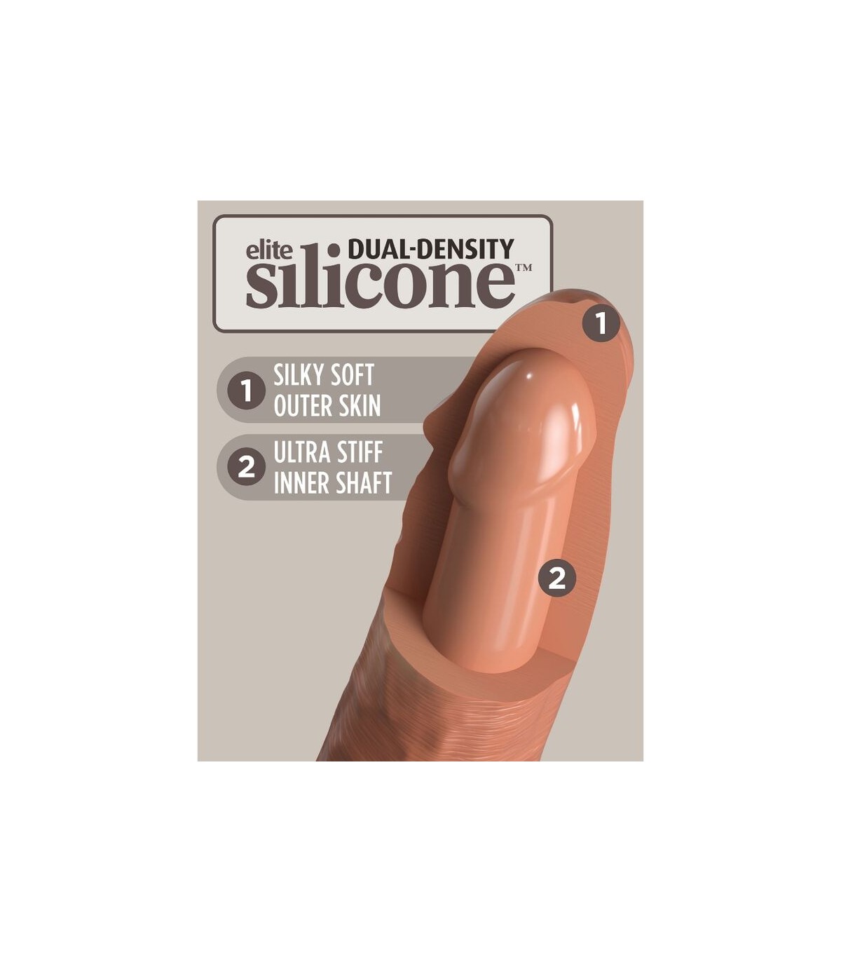 Este consolador de silicona King Cock Elite está hecho de silicona Elite de doble densidad de alta calidad, lo que lo hace rígido por dentro y suave por fuera.
