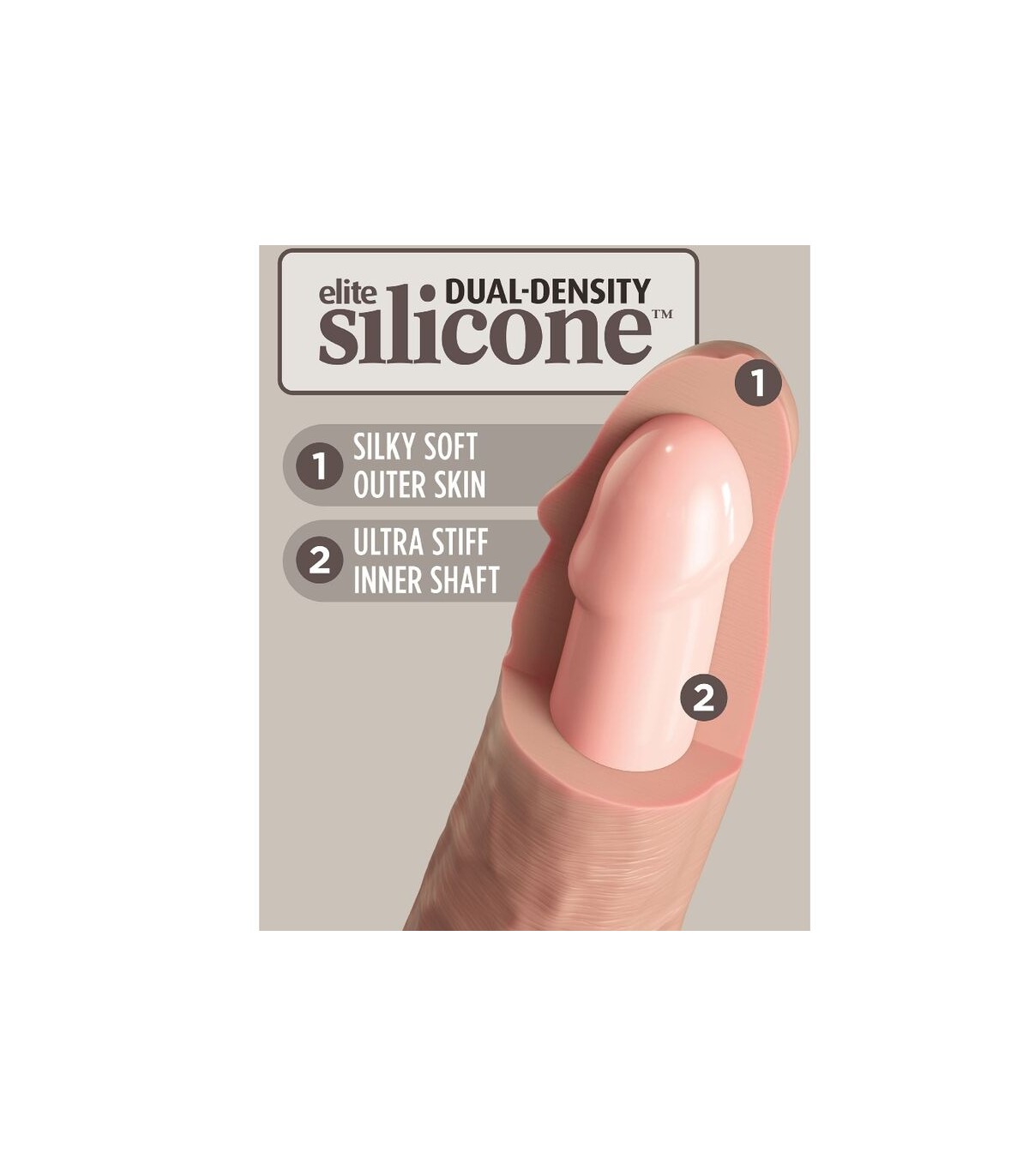 Este consolador de silicona King Cock Elite está hecho de silicona Elite de doble densidad de alta calidad, lo que lo hace rígido por dentro y suave por fuera.