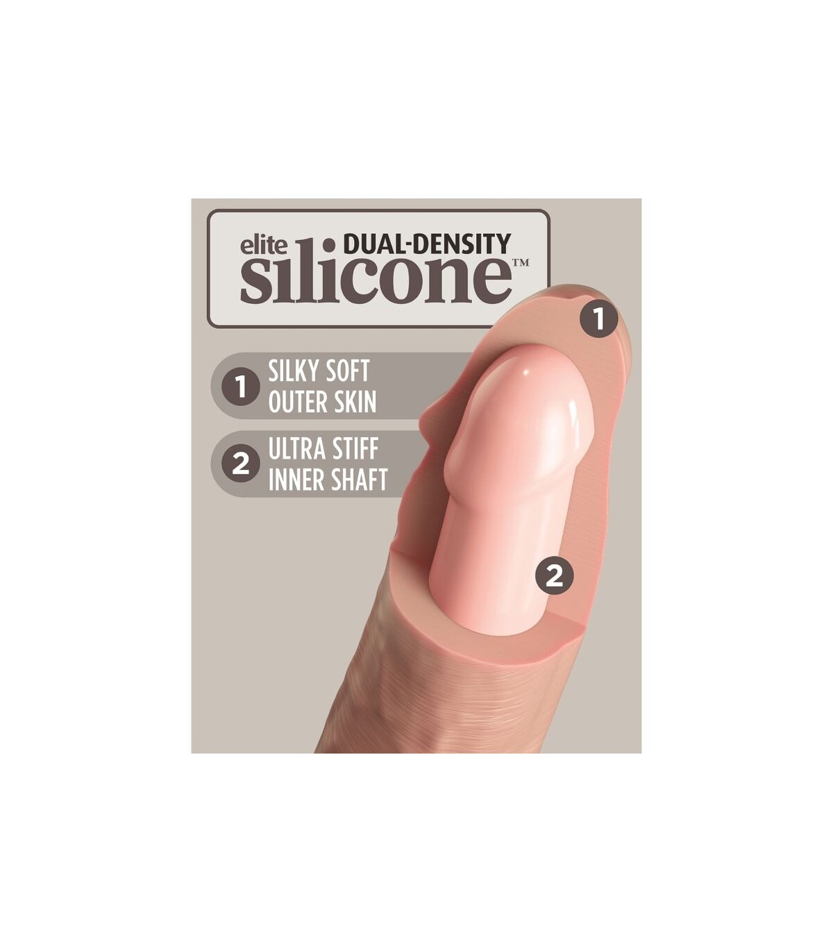Este consolador de silicona King Cock Elite está hecho de silicona Elite de doble densidad de alta calidad, lo que lo hace rígido por dentro y suave por fuera.