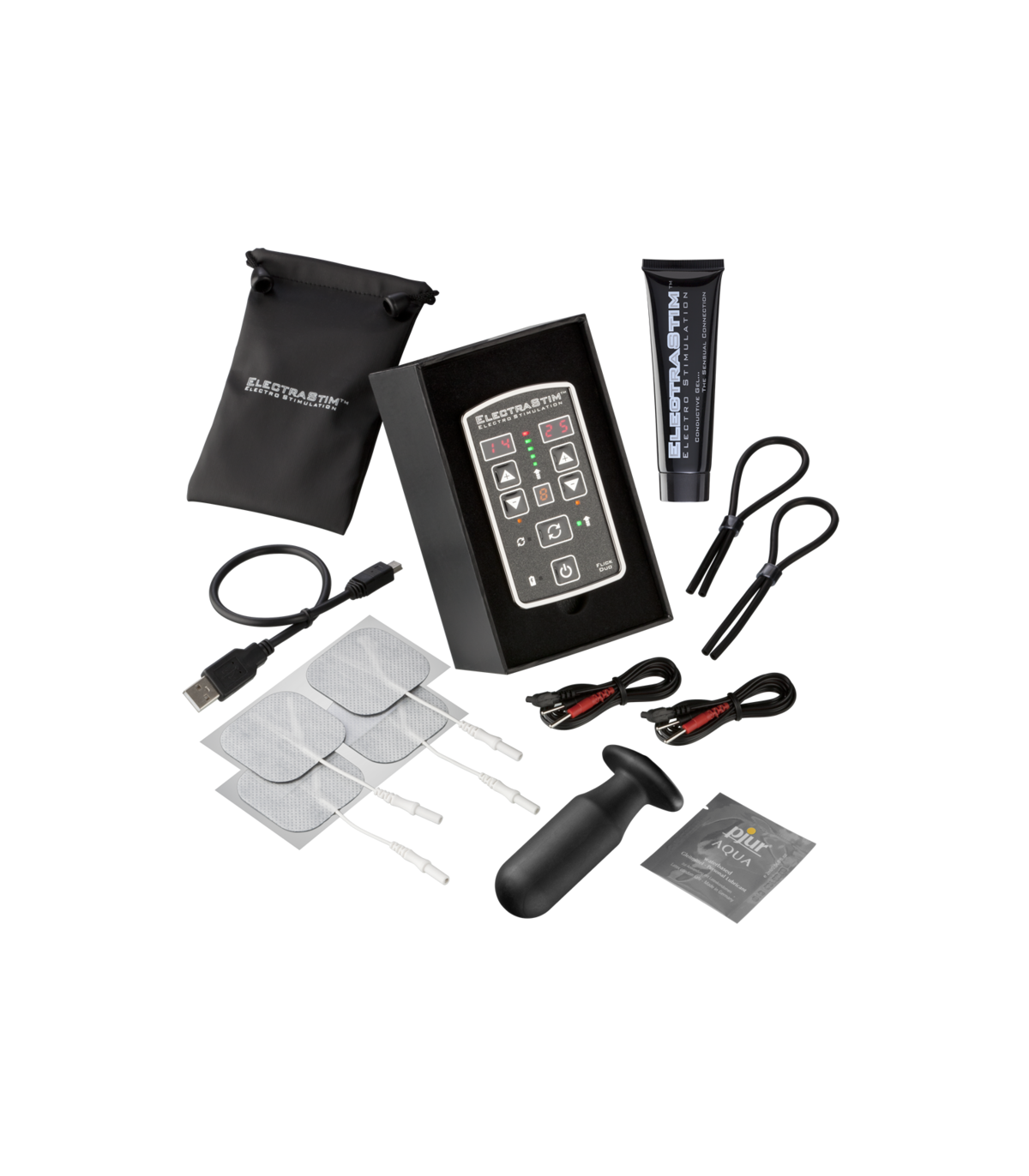 El paquete de ElectraStim Flick EM80-M incluye un estimulador Flick Duo de doble canal, todos los cables necesarios, un conjunto de 4 ElectraPads, 2 anillos para el pene ajustables ElectraLoops y un electrodo Silicone Noir Aura (adecuado para su uso vaginal y anal).