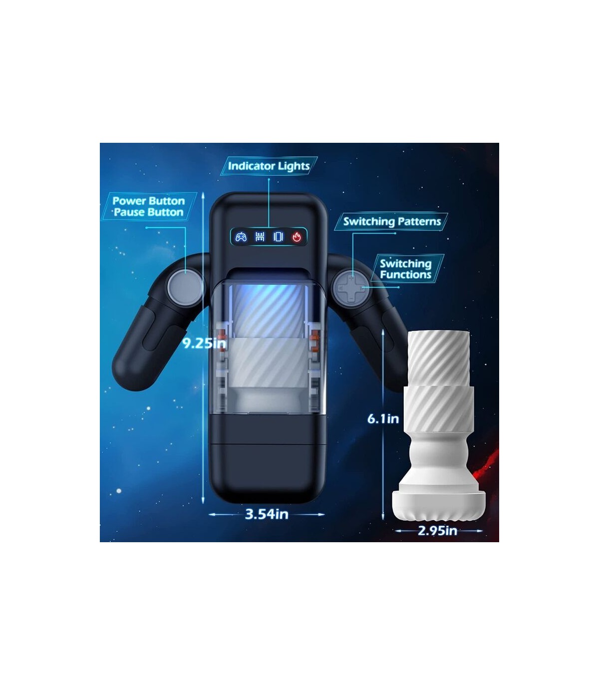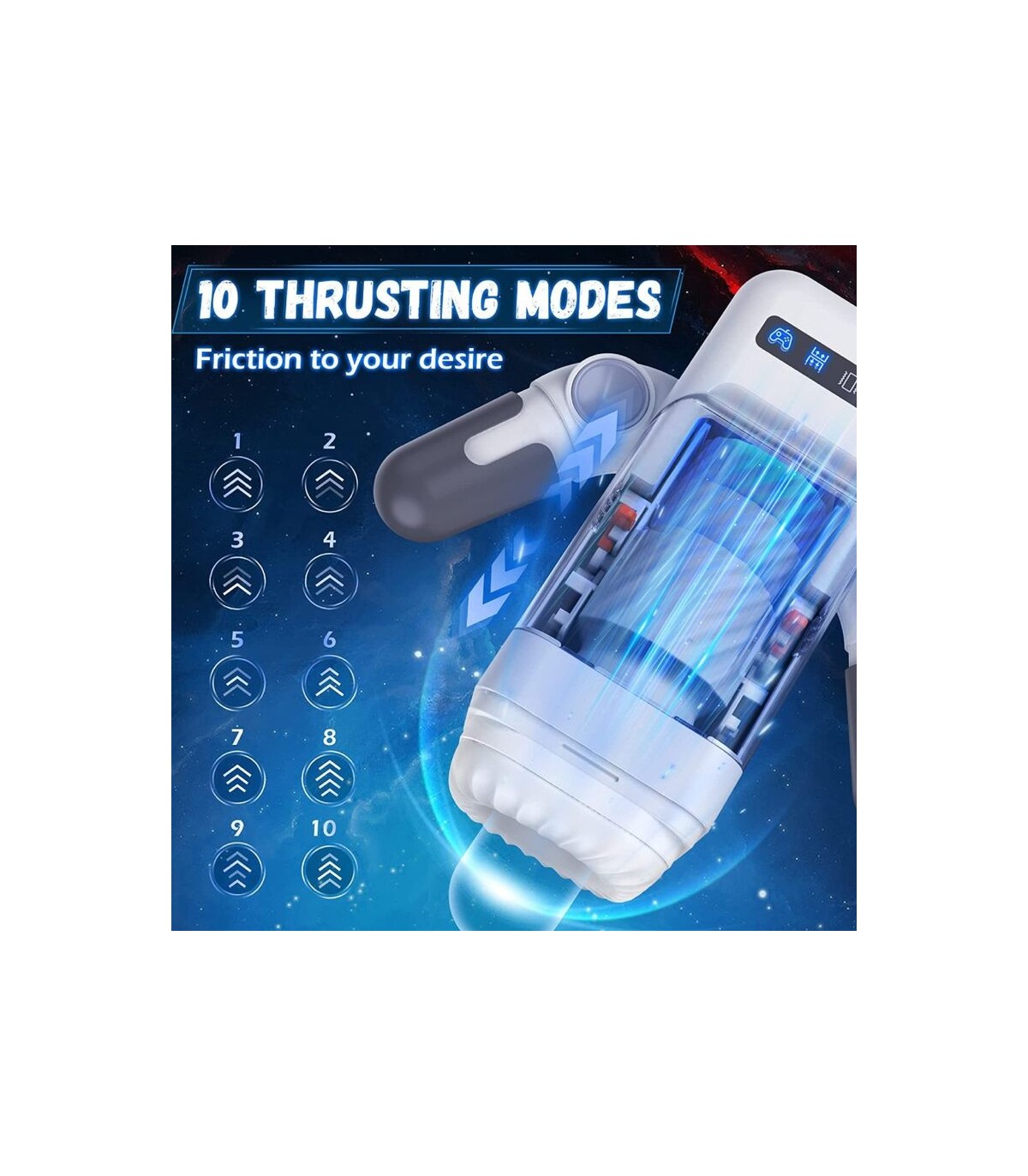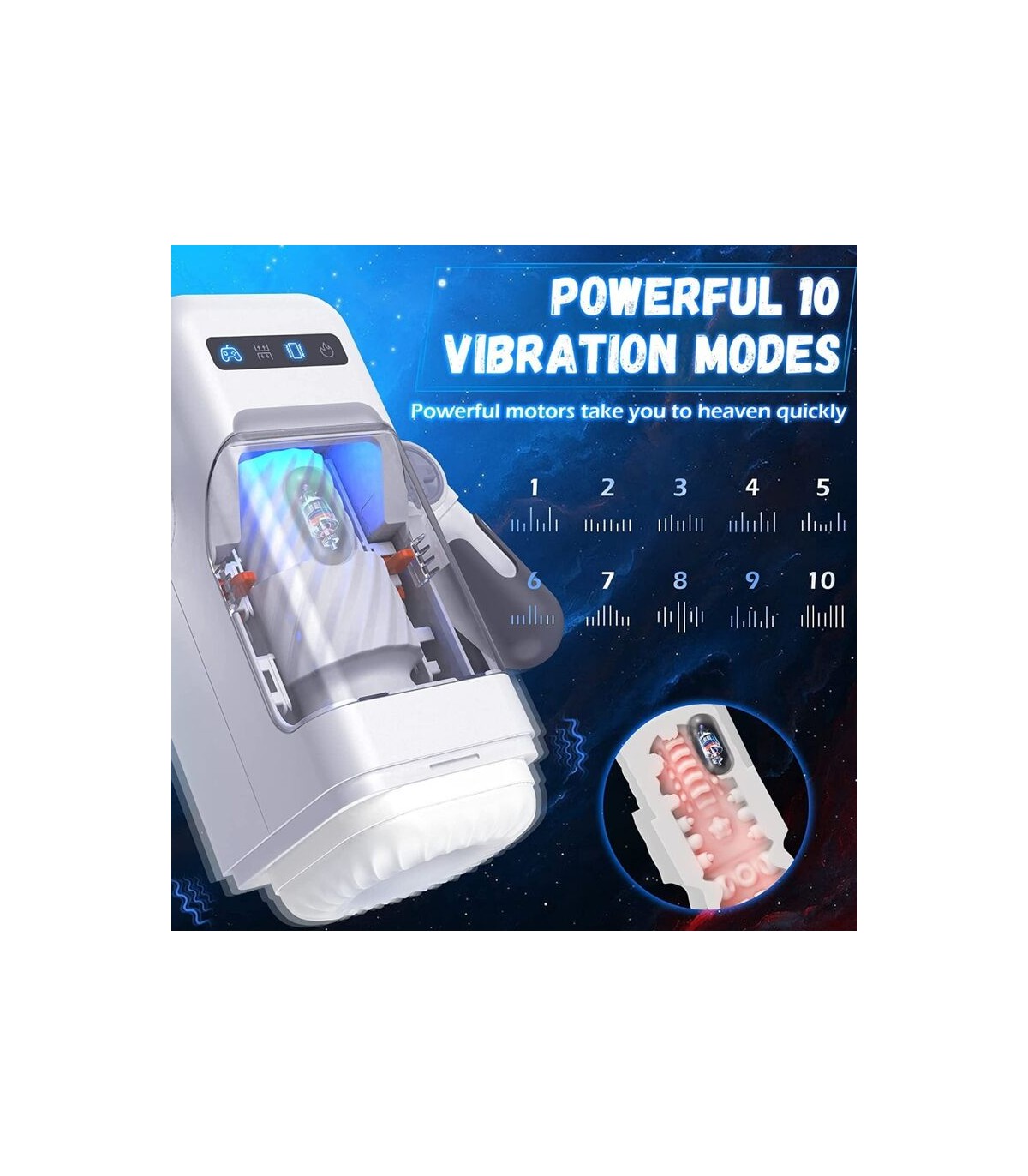 - 10 modos de empuje y vibración: 10 potentes patrones de vibración para aumentar tu libido al límite. El masturbador masculino es un masturbador vibratorio de empuje único capaz de desarrollar tus sentidos al máximo, hasta que el hormigueo y los escalofríos comiencen y se extiendan por todo tu cuerpo. El acariciador automático empuja y vibra tan intensamente que no puedes evitar tensar los músculos con fuerza y la liberación se siente en lo más profundo de tu interior.