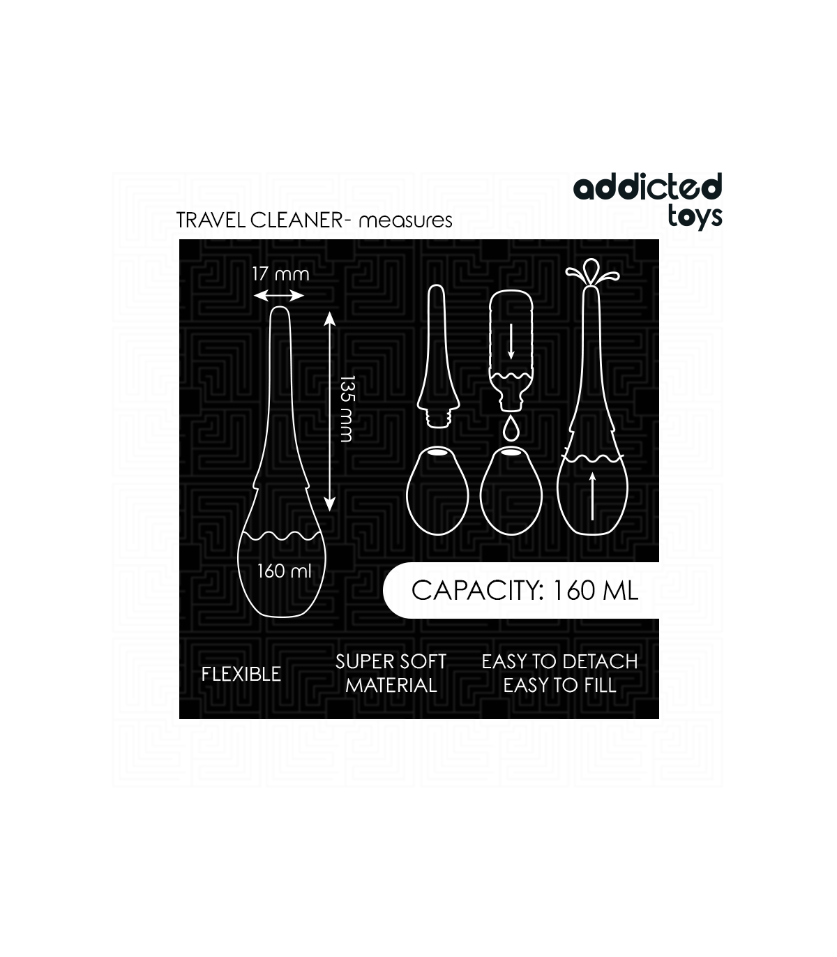 El limpiador de viaje modelo 3 de Addicted Toys es una solución práctica y eficiente para mantener tus juguetes sexuales limpios y en perfectas condiciones, especialmente cuando estás de viaje o fuera de casa. Su diseño portátil y funcional facilita la limpieza rápida y efectiva de tus juguetes, asegurando una higiene óptima durante tu rutina.