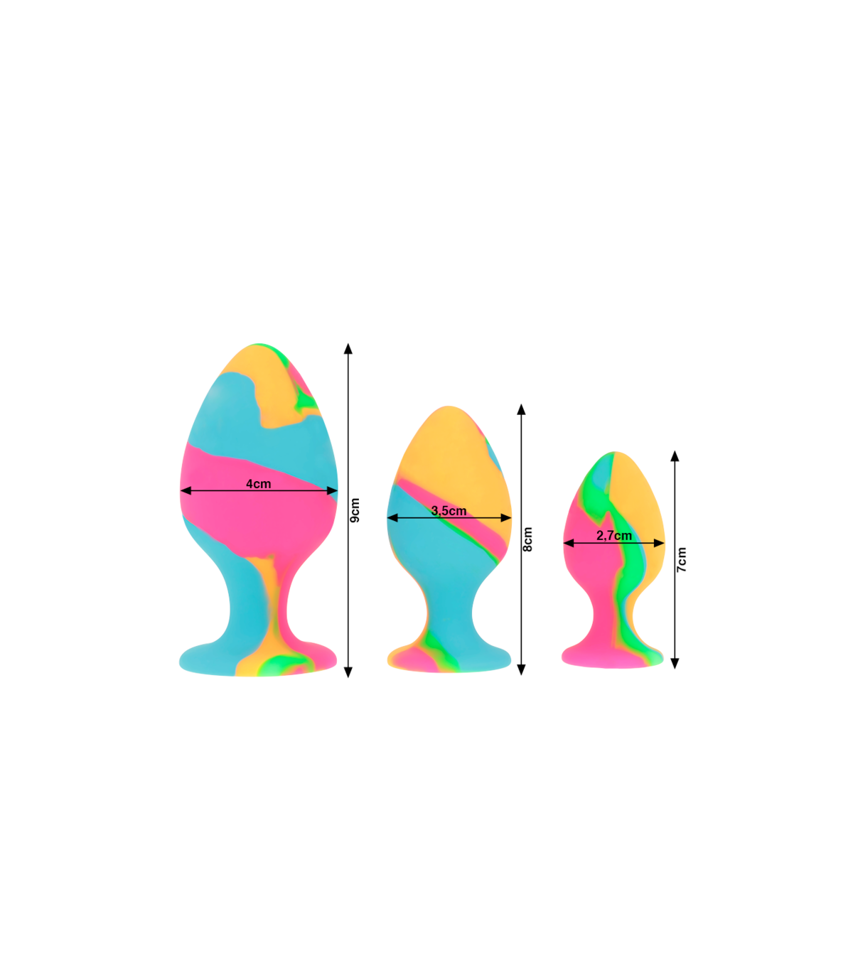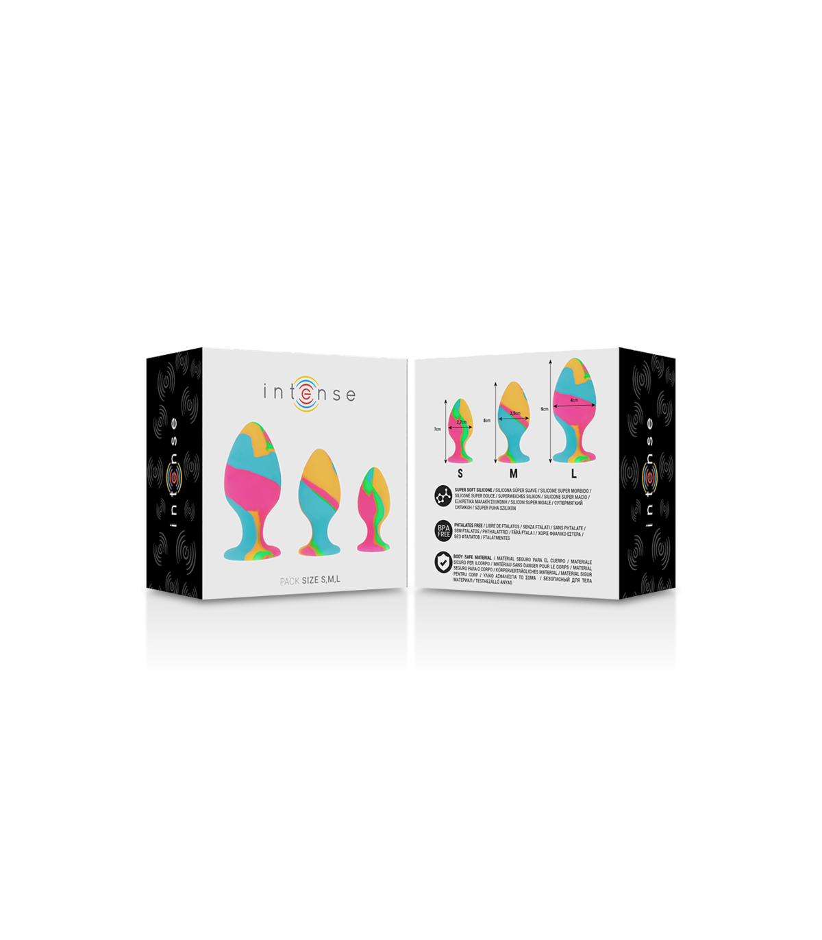 Libera tu lado salvaje y disfruta de un placer fuera de lo común con Intense™ Anal Plugs Sets . Este atrevido set de plugs anales está fabricado para pasar un buen rato con el brillante diseño tie-dye, la sonda cónica redondeada y la versátil base de ventosa para un juego extra divertido. La sonda de silicona aumenta gradualmente su circunferencia para permitirte disfrutar de un juego satisfactorio con un diámetro desde 2.7cm a 4cm.