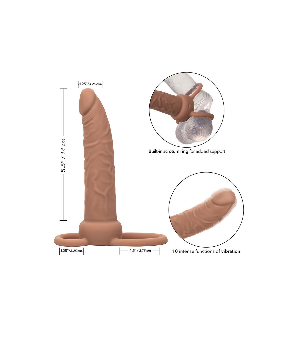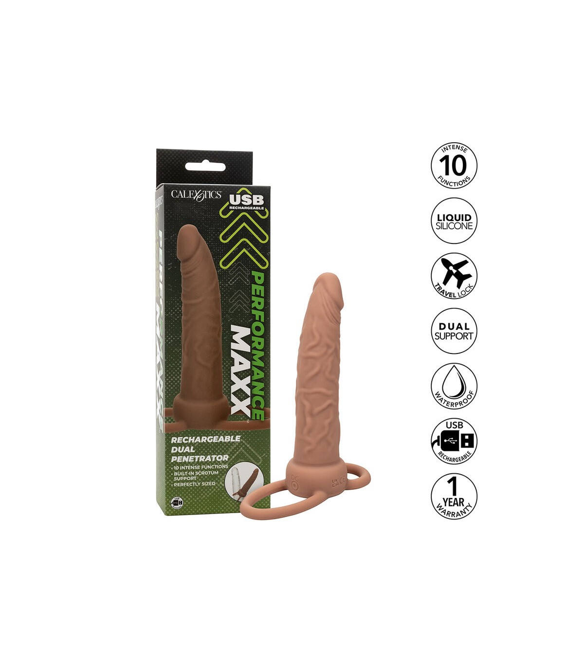 Disfrute del placer erótico de la doble penetración con el penetrador dual recargable Performance Maxx. El potenciador de sonda de contorno sensual está diseñado para el éxtasis anal con una sonda vibratoria de sensación real, anillos de soporte incorporados y 10 funciones de vibración que hace temblar las rodillas. El cómodo diseño de doble anillo proporciona soporte adicional para el escroto y el eje para una diversión prolongada de doble penetración. El eje retumba con 10 funciones de vibración para sumergirse profundamente en el emocionante placer de la puerta trasera. Para una mayor sensibilidad y el máximo placer orgásmico, utilice siempre un lubricante de calidad con este juguete. Realice sus fantasías secretas de tríos con la emocionante sonda curva con textura y cabeza realistas. La sonda de forma erótica maximiza el placer de la penetración y también ayuda a mantener una erección dura como una roca para una mayor satisfacción del desempeño. Recarga tu placer en poco tiempo con un tiempo de carga de 1,5 horas y disfruta de un tiempo de reproducción de hasta 90 minutos.