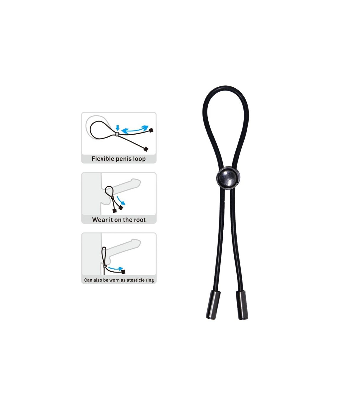 El bucle para el pene está controlado por una perla sintética para que pueda colocarse sobre el pene y los testículos. Puedes ajustar individualmente el diámetro al tamaño del pene. De esta manera, la intensidad del efecto de restricción del flujo sanguíneo se puede ajustar según los deseos personales.