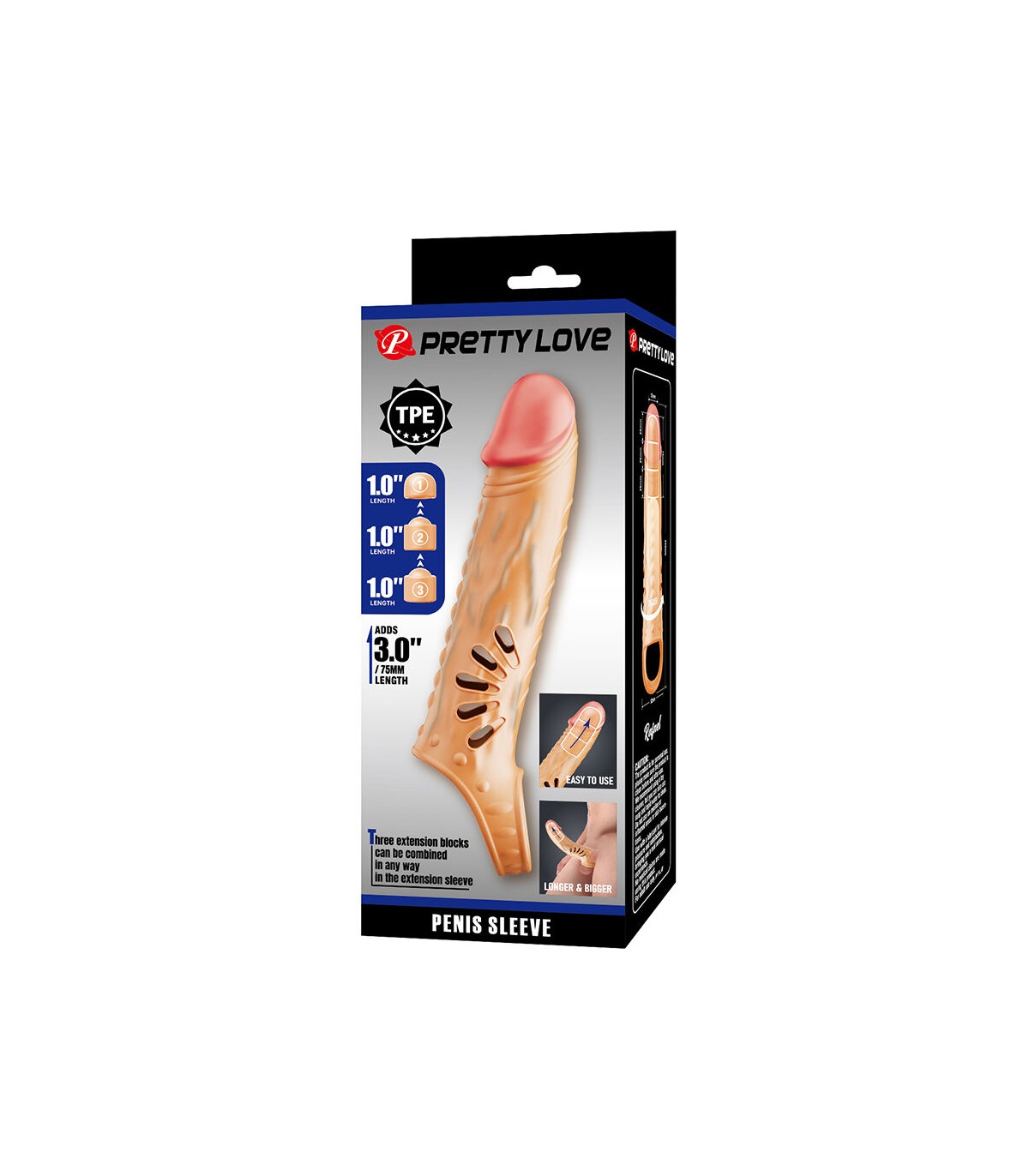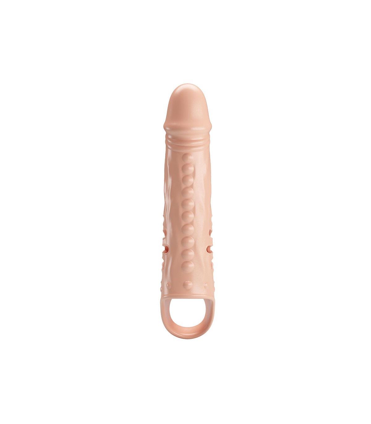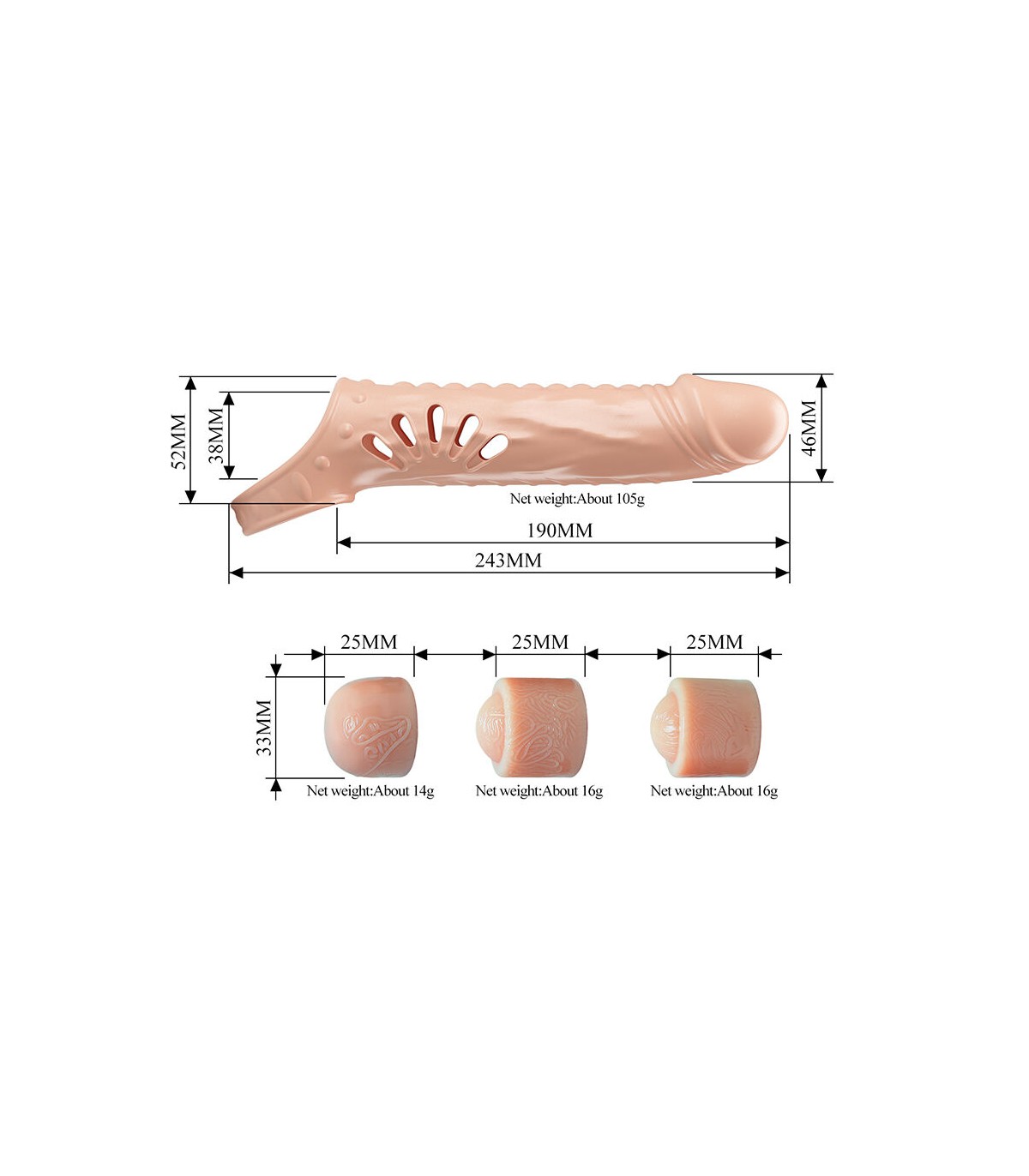 Elegante funda extensora de pene fabricada en TPE de alta calidad, diseñada para aportar mayor longitud y grosor, ofreciendo una experiencia más intensa y placentera durante la penetración.