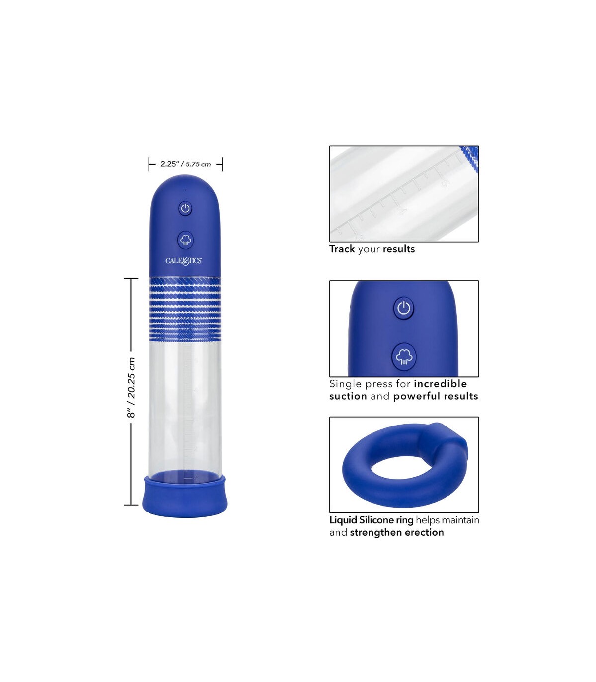 La bomba cilíndrica y el anillo grueso están diseñados para crear el sellado perfecto y una succión potente con solo tocar un botón. Una vez que haya alcanzado su nivel máximo de bombeo, use la liberación rápida de aire para disminuir la succión o liberar el sello. Cuando se usa regularmente, este poderoso bombeo puede aumentar la resistencia, mejorar el tamaño general y amplificar la sensación. Recarga la bomba premium en 2 horas con el cable de carga USB incluido para disfrutar de 3 horas de succión apasionada. Para seguir el progreso, utilice las marcas de medición incrementales en el eje del cilindro.