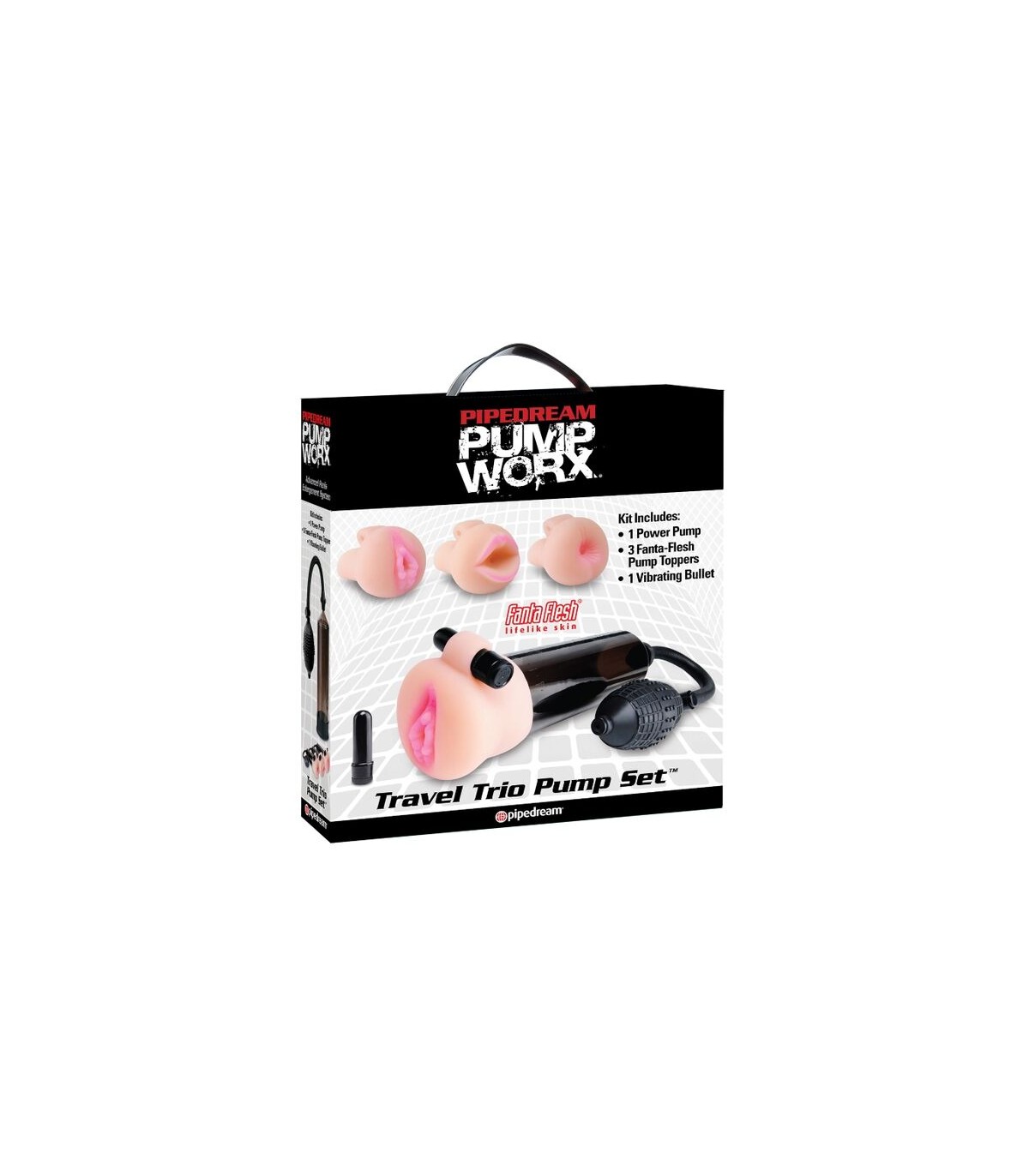 ppDisfruta de tu intimidad cuando estas de viaje con el confort de como si estuvieras en tu casa con este desarrollador de viaje ppEsta coleccion de viaje transforma un desarrollador en una combinacion entre masturbador y bomba de succion ppEste kit de lujo compuesto por 9 piezas viene en una comoda caja de facil transporte con una bomba succionadora para principiantes 3 cabezales Fanta Flesh que te haran sentir como si estuvieras teniendo sexo vaginal anal y oral una bala vibradora resistente al agua un anillo para el pene y muestras gratuitas de lubricante Moist Lubricant jabon limpiador Pump Worx Toy Cleaner y crema espesante ppLos cabezales de Fanta Flesh son muy faciles de acoplar y tienen la opcion de acoplarle la bala vibradora para ampliar tu placer pulli100 Libre de PhalatospEnvolveran cada cada milimetro de tu varita magica del placerbr Con cada apreton que le des a la bomba de estilo medica tu placer ira subiendo cada vez mas hasta alcanzar el cielo del placer ppUna vez que introduces tu pene por la apertura de PVC veras como se pone dura como una piedra rigida como un arbol y mas duradera que Matusalen y a su vez la sensacion te va gustando mas y mas y mas ppEl tubo de vacio transparente te permite ver crecer a tu grandullon y la valvula de liberacion rapida te permite aliviar la presion ppPara prolongar tu ereccion desliza el anillo a lo largo de tu miembro hasta que lo encuentres comodo pero ajustado ppUna vez hayas terminado y para mantenerlo como si fuera nuevo te recomendamos que simplemente separes el cilindro de la bomba de vacio y lo limpies con agua tibia y nuestro Pump Worx Toy Cleaner pulliMedidas 205 cm x 8 cm liliPilas Incluidas p