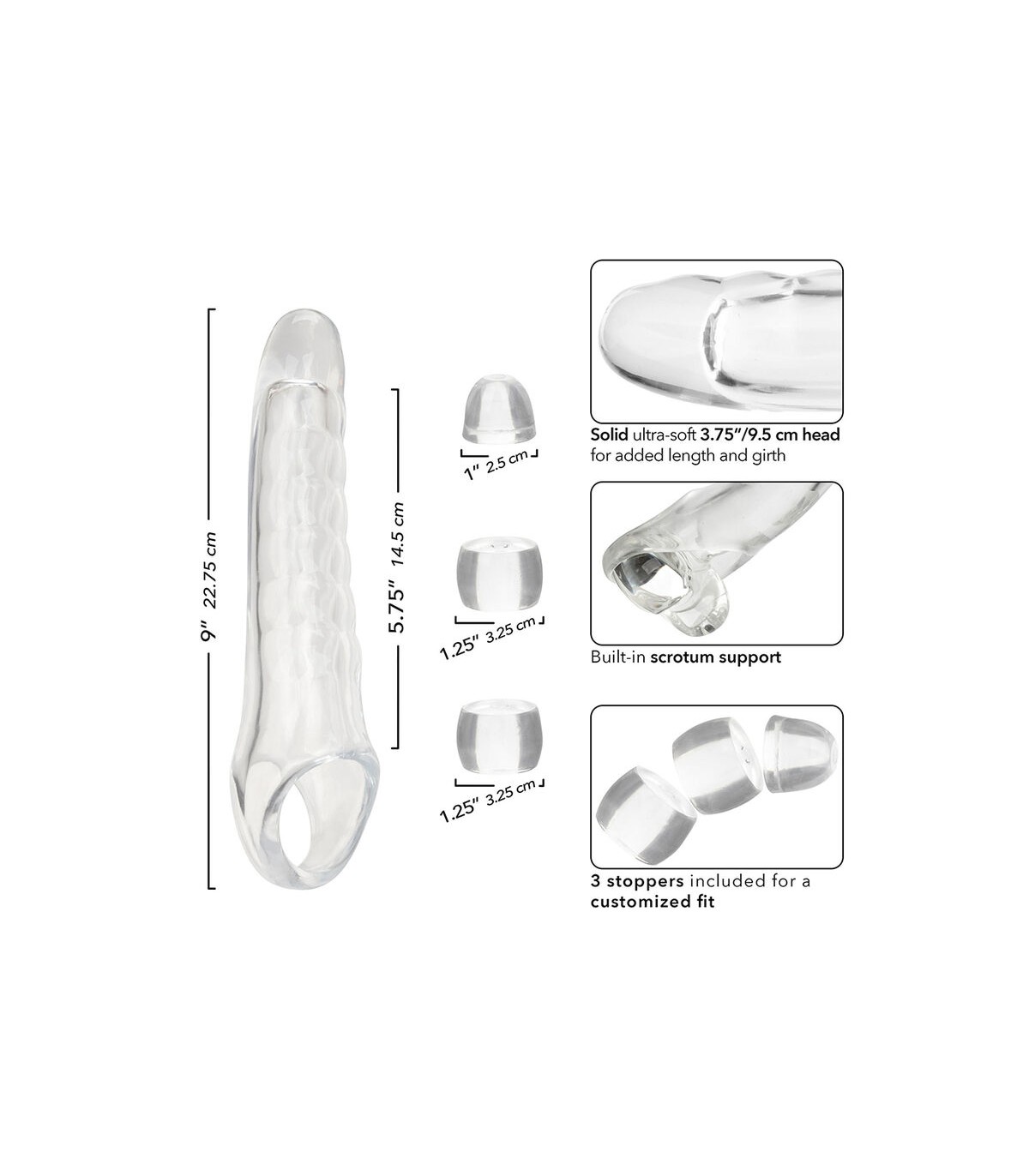 Hecho con material transparente y elástico, realza los atributos naturales mientras se siente realista. Su diseño hueco, con una correa de escroto incorporada, añade estabilidad. Tres tapones permiten ajustes a medida para máximo confort. Fabricado con material seguro para el cuerpo, sin fragancia y libre de ftalatos, garantiza un disfrute sin preocupaciones.