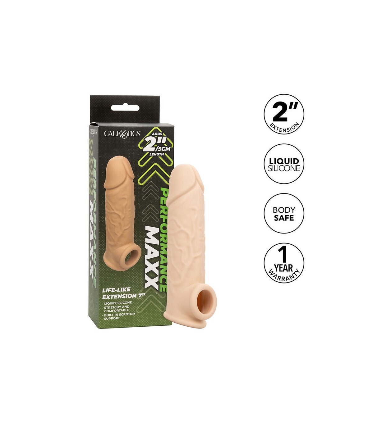Llévelo a nuevas longitudes con la extensión Performance Maxx Life-Like de 7”. La funda realista con diseño hueco agrega 2 pulgadas 5 cm a su longitud para una experiencia de placer mejorada. La correa para el escroto incorporada y la funda gruesa brindan mayor soporte para la erección y mayor resistencia para prolongar e intensificar el placer para ambos socios. Aumente su placer y nunca se conforme con menos cuando se trata de tamaño, nuestro extensor súper elástico con correa de soporte para el escroto hará que usted y su amante anhelen más, más, más. Nuestro potenciador súper elástico se estira para adaptarse y facilitar su uso. La silicona líquida de primera calidad no tiene perfume, ftalatos y no necesita mantenimiento para mantener los puntos más sensibles felices y saludables.