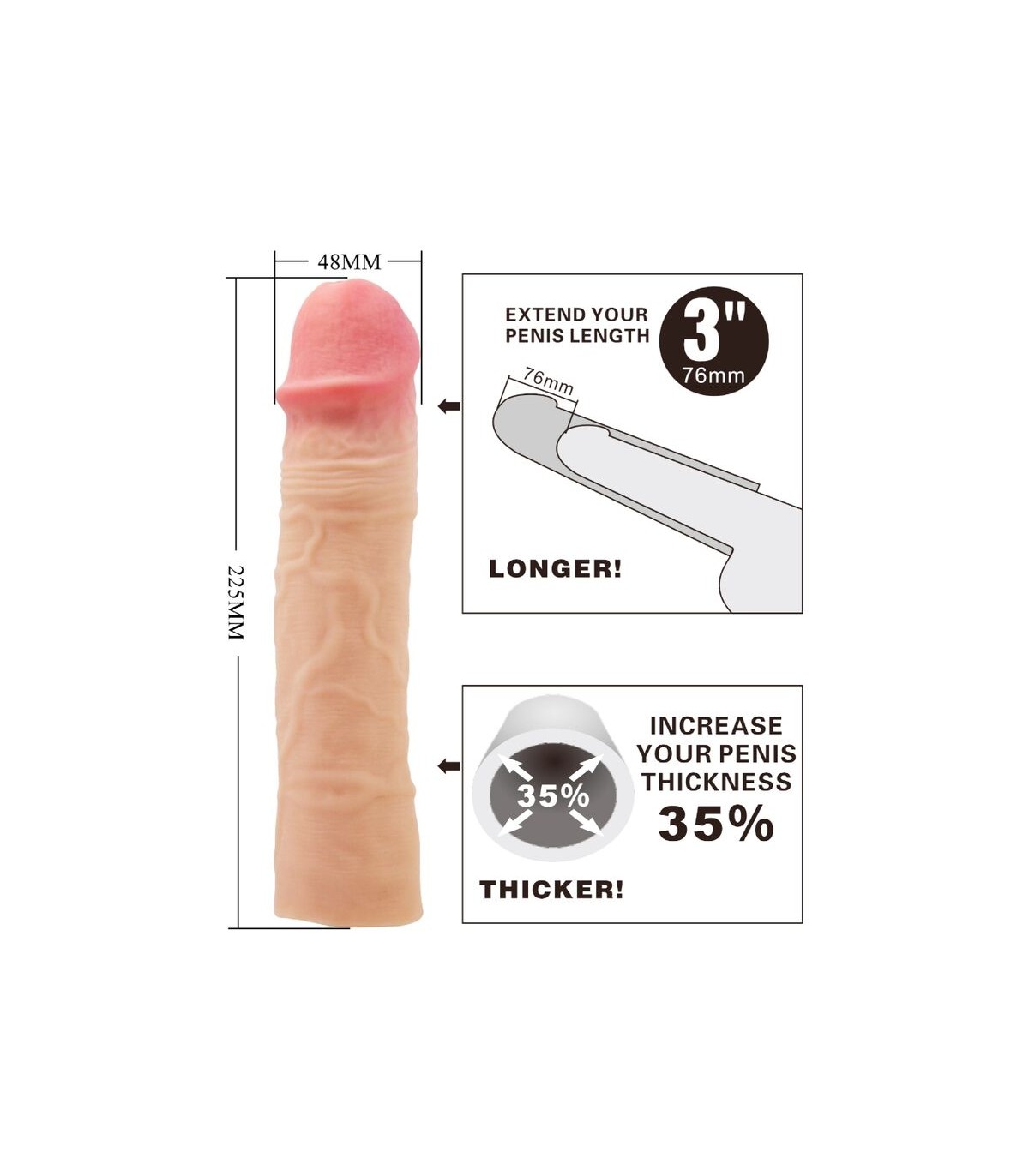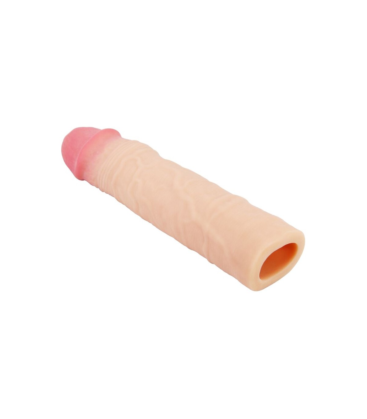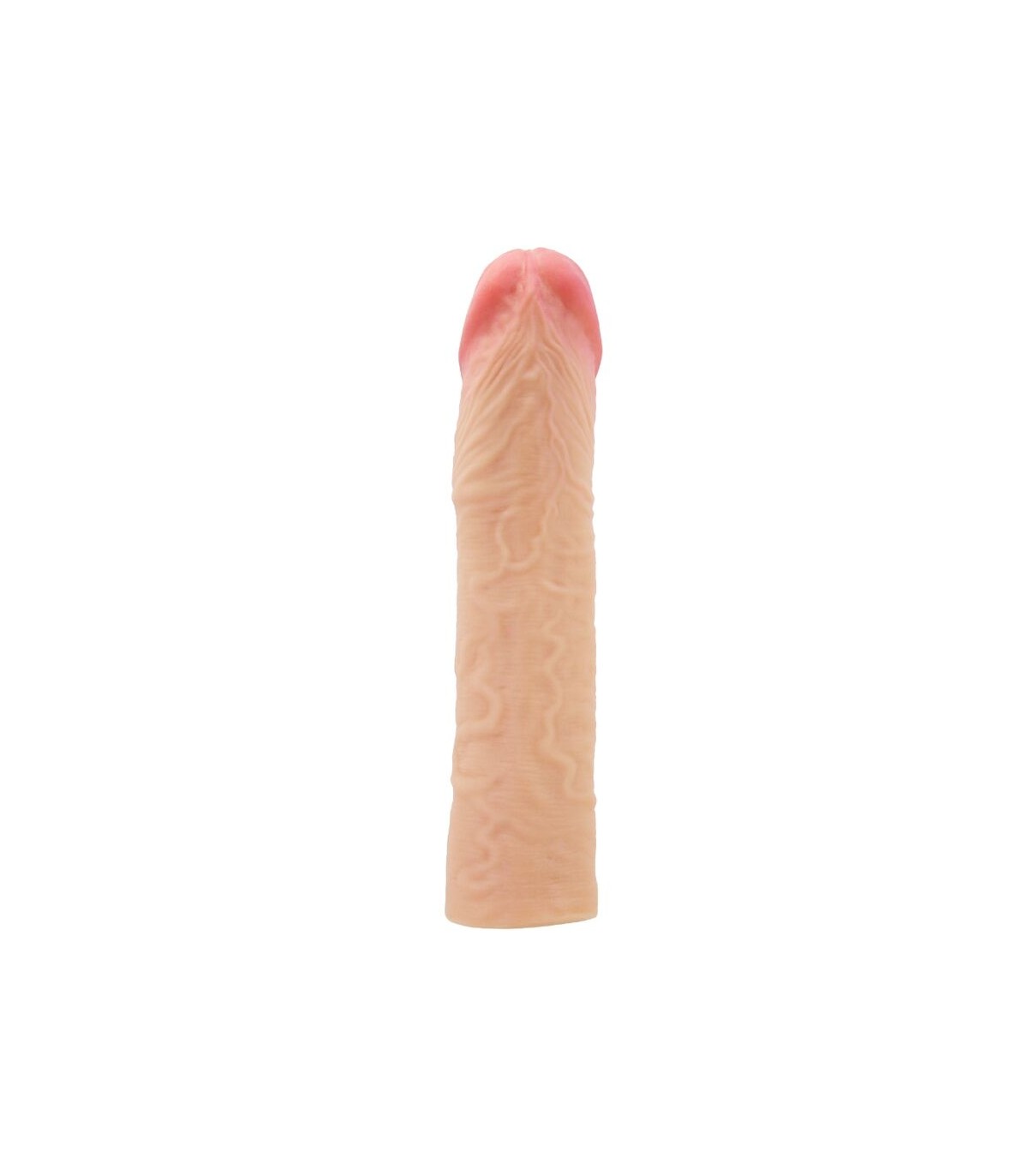 Aumente el tamaño de su pene con esta funda para el pene de placer. Fabricada con material ultra realista para un placer realista. La superficie externa está texturizada con venas realistas y presenta una cabeza bulbosa para garantizar que su amante experimente sensaciones naturales. Un canal interno suave abraza su erección para un máximo contacto y estimulación.