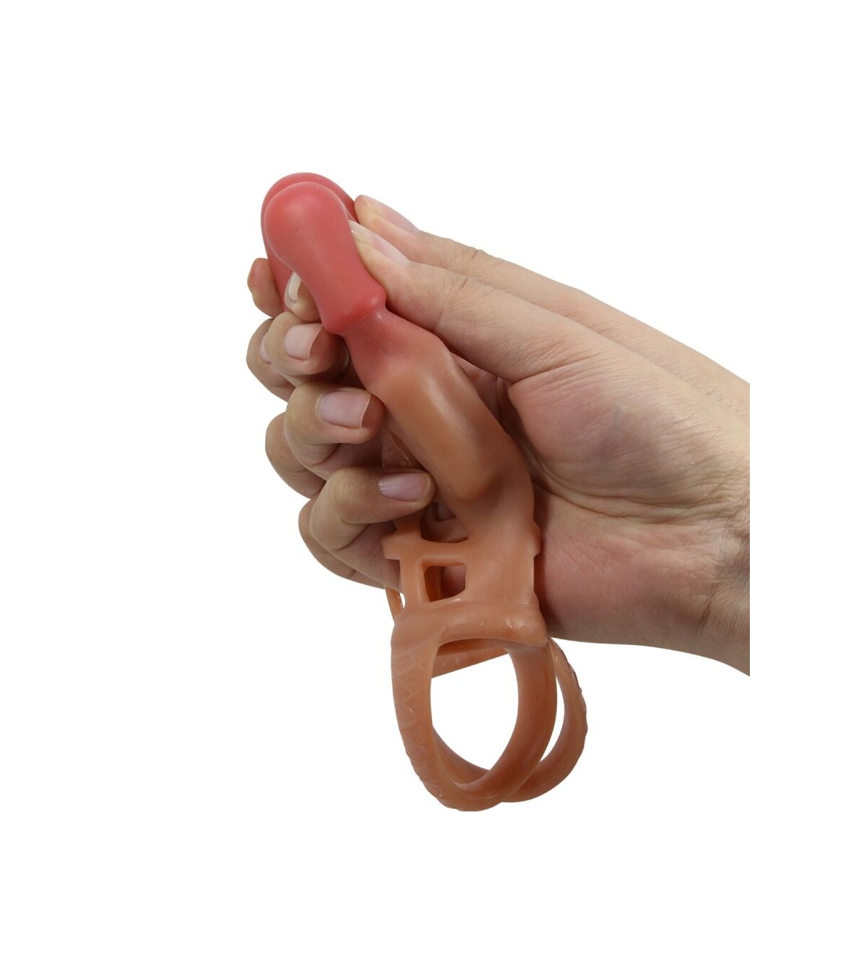 ¡Cambia las cosas con esta funda para el pene y los testículos! Disfruta de los sensacionales beneficios de un extensor de testículos, mientras envuelves tu pene en una funda que agrega longitud, circunferencia y textura. Los anillos ajustados aumentarán la sensibilidad en tu pene y testículos. Este potenciador del pene es una manera fácil de follar a tu pareja con una polla grande y dura y cumplir todas tus fantasías.