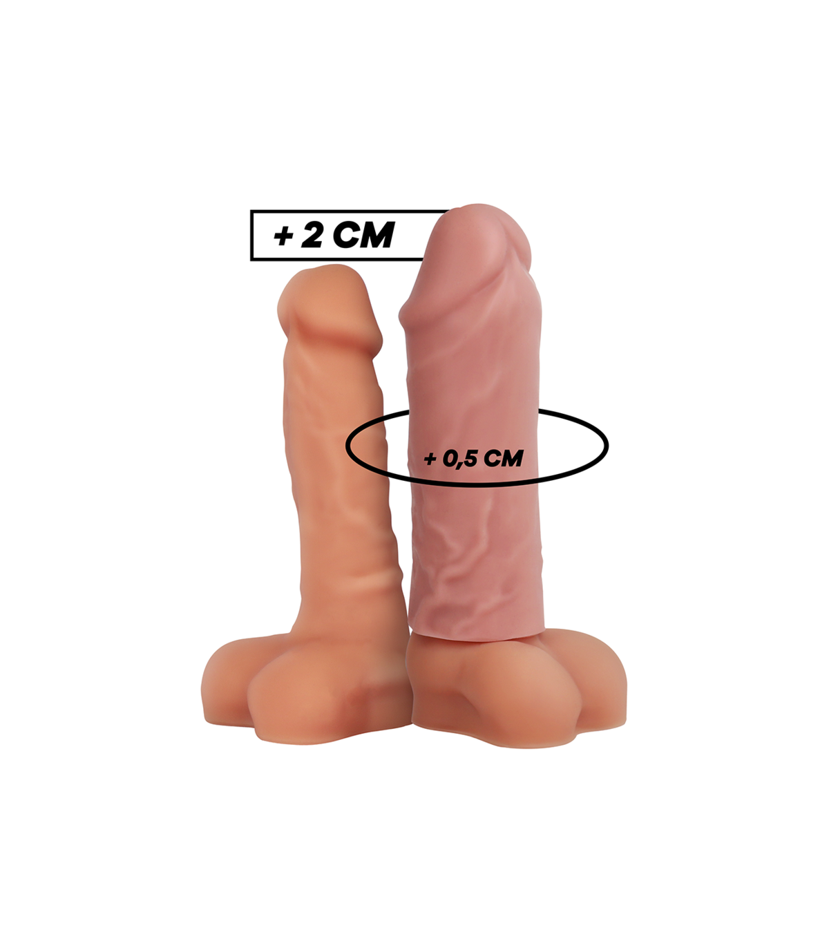 ¡Desliza la manga sobre tu erección y satisface todos sus deseos con tu nuevo tamaño aún más grueso! El material súper suave fabricado 100% en silicona médica, queda como una segunda piel o incluso mejor!