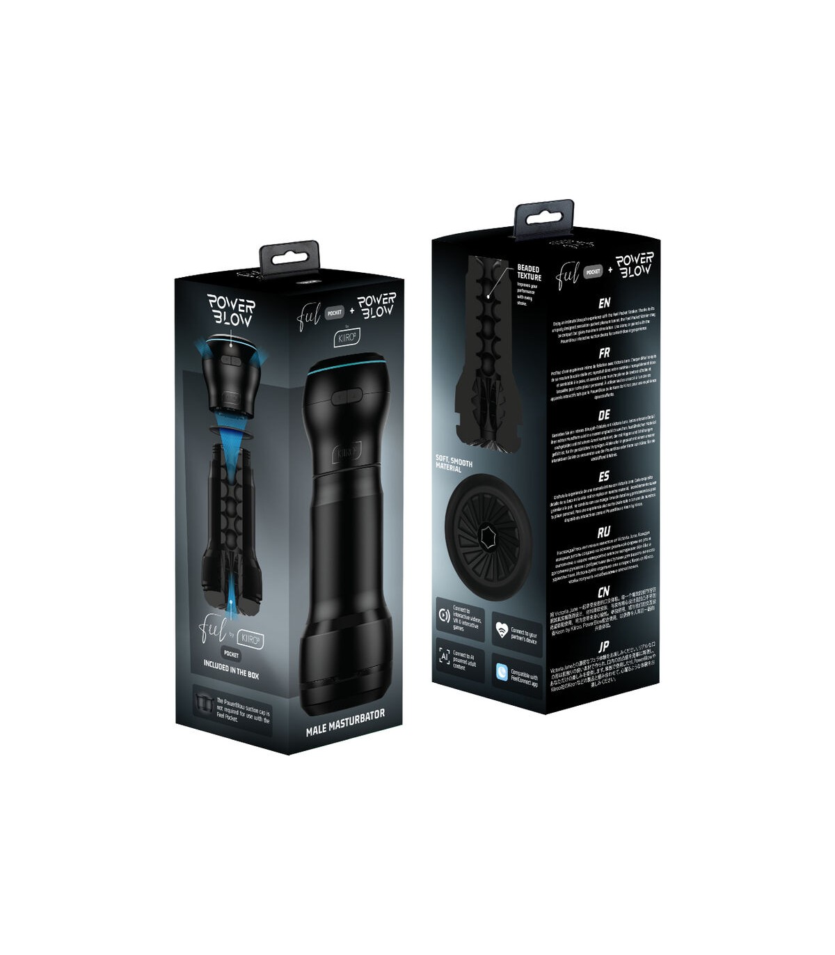 Esta caja combinada viene con Feel Pocket y el galardonado dispositivo de succión de Kiiroo, PowerBlow, para brindar a los usuarios las experiencias de mamada más intensamente placenteras.