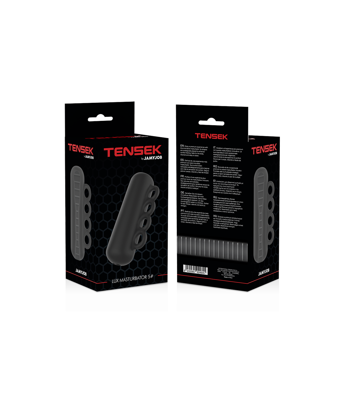 Disfruta de una experiencia completamente nueva. El innovador modelo TENSEK 5 se une a la línea JAMYJOB de masturbadores y presenta un diseño único completamente negro con agarre facil.