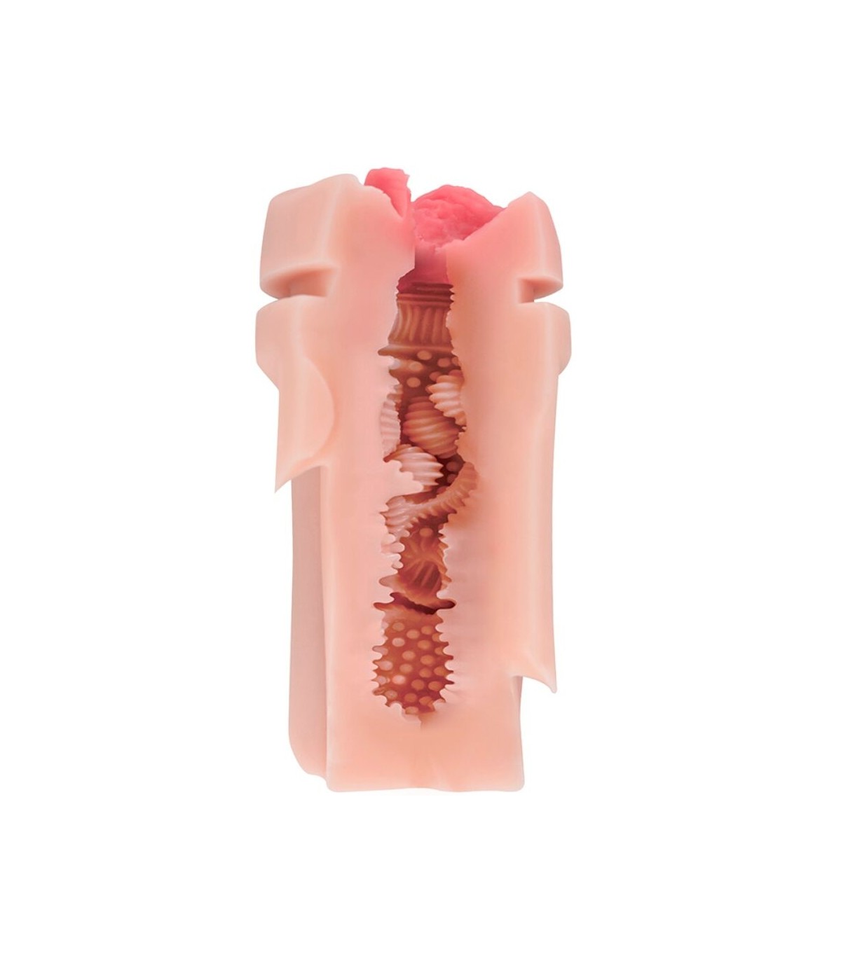 - Textura interna estimulante: El túnel interno está diseñado con estrías, nódulos y cámaras de succión que aumentan la fricción y la sensación de presión alrededor del pene. Las vibraciones se distribuyen a lo largo del canal, creando una experiencia aún más realista y satisfactoria.