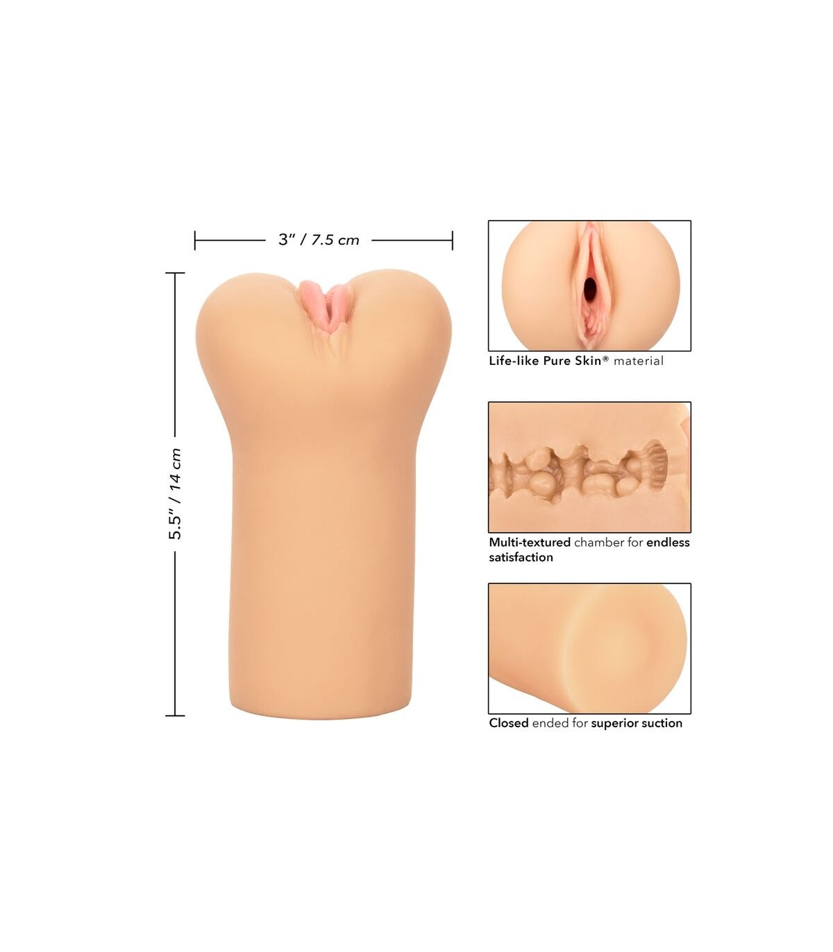 Material de imitación a piel real | Suave, ajustado y elástico | Cámara con múltiples texturas para una satisfacción infinita | Extremo cerrado para una succión superior | Higiénicamente superior y sin mantenimiento