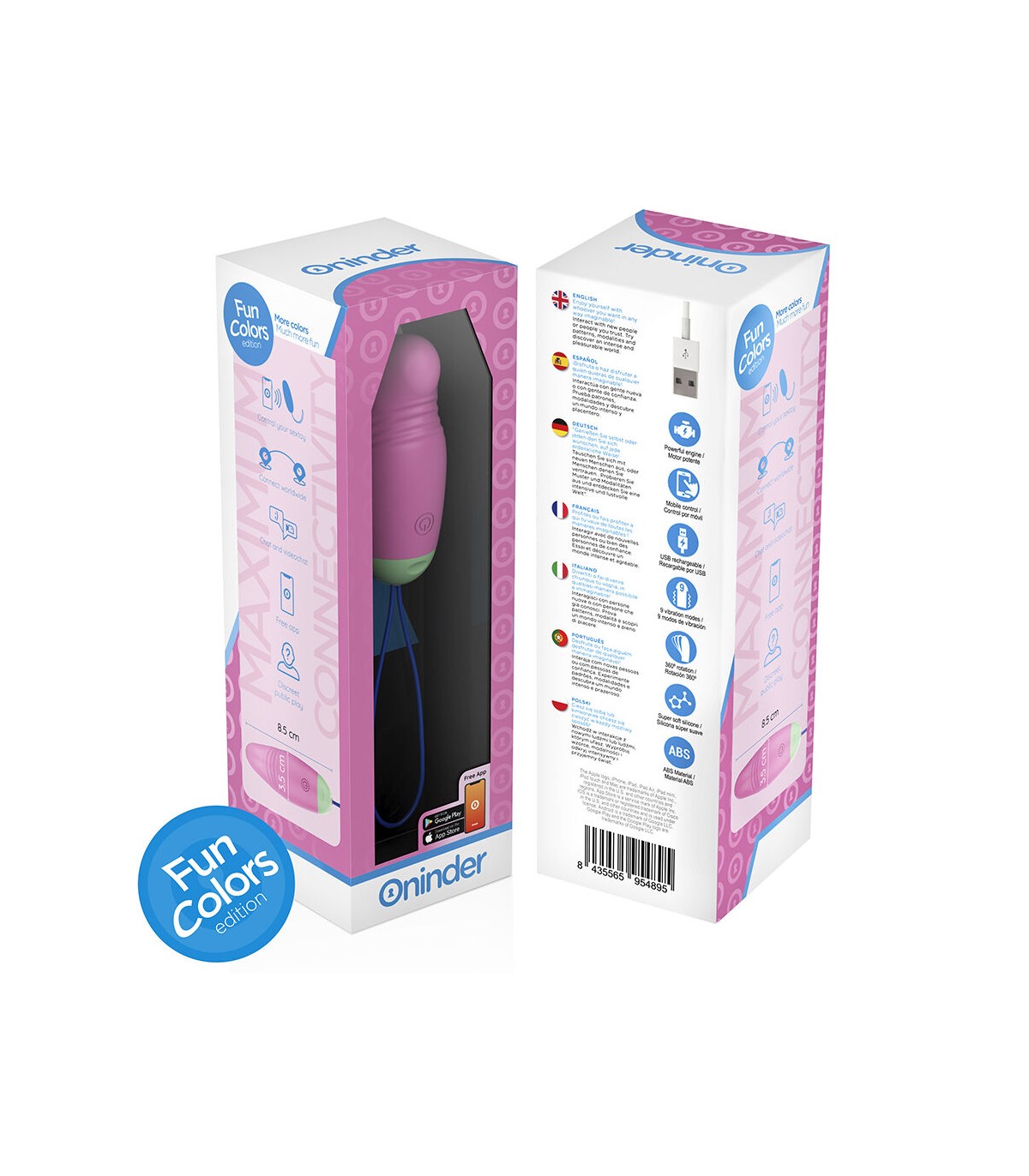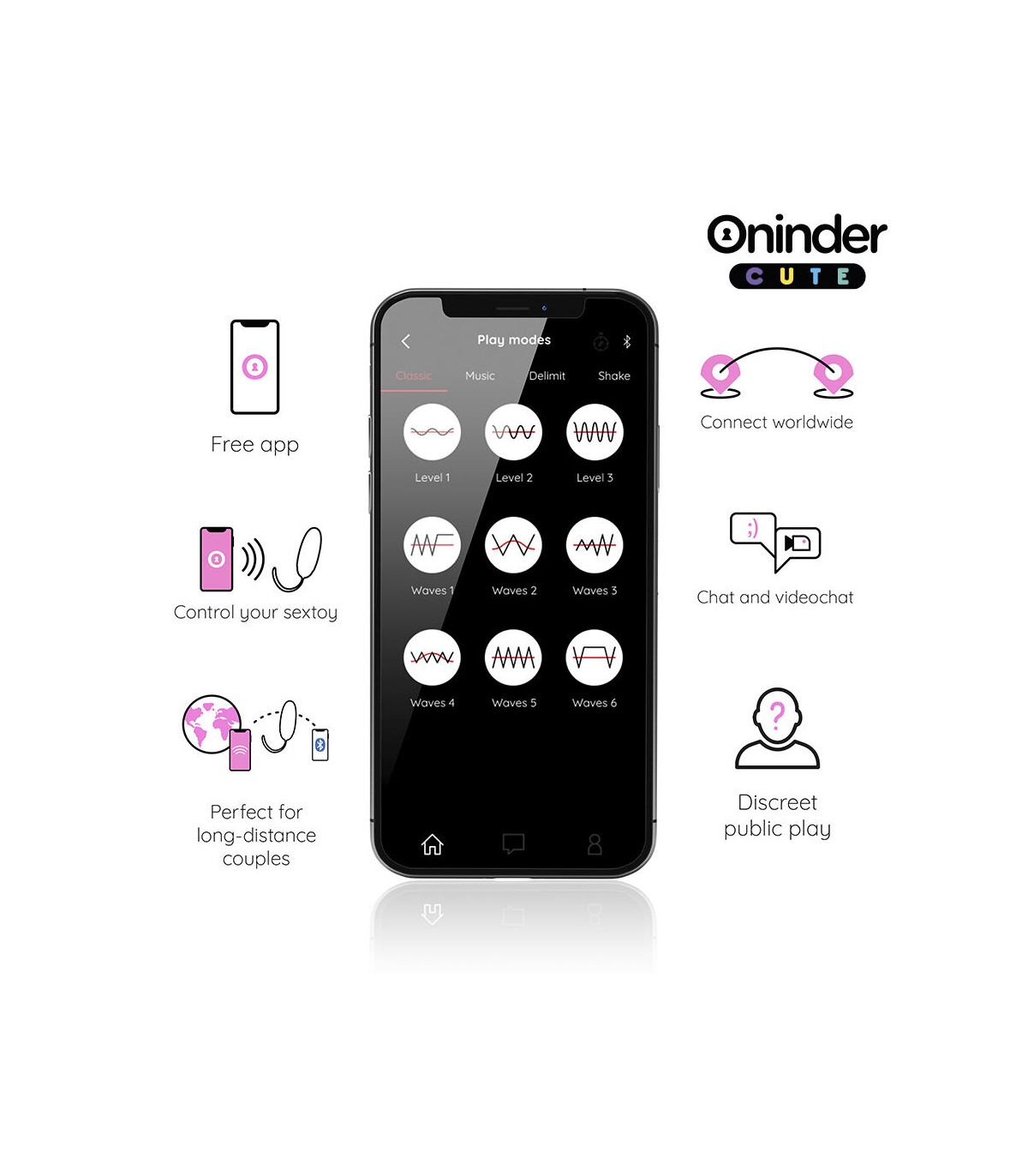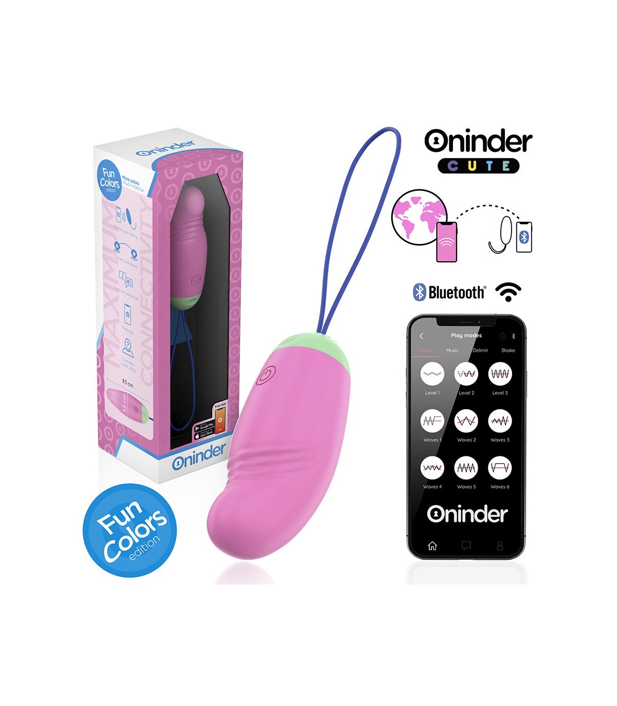 Con este vibrador no solamente puedes elegir entre combinaciones de intensidad y vibraciones preestablecidas, sino que también puedes compartir a un innovador control basado en una aplicación. Simplemente tienes que descargar la aplicación gratuita ONINDER™ en tu dispositivo Android o iOS y conectar tu smartphone o Tablet.