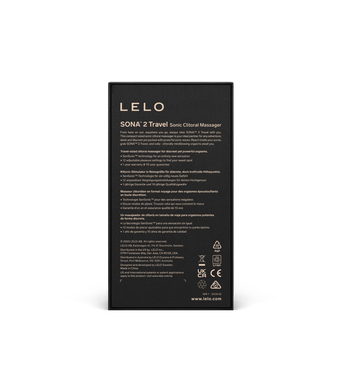 SONA™ 2 Travel es la versión compacta de nuestro superventas SONA™ 2. Ha sido desarrollado para mejorar la experiencia íntima del usuario con su diseño elegante, discreto y compacto. Usa la exclusiva tecnología SenSonic™ de LELO, que ofrece al clítoris una potente estimulación de ondas sónicas para que acabes increíblemente satisfecha. SONA™ 2 Travel es el compañero perfecto para aquellas que buscan el placer en sus múltiples viajes, ya que te permite acceder fácilmente al orgasmo en todo momento.