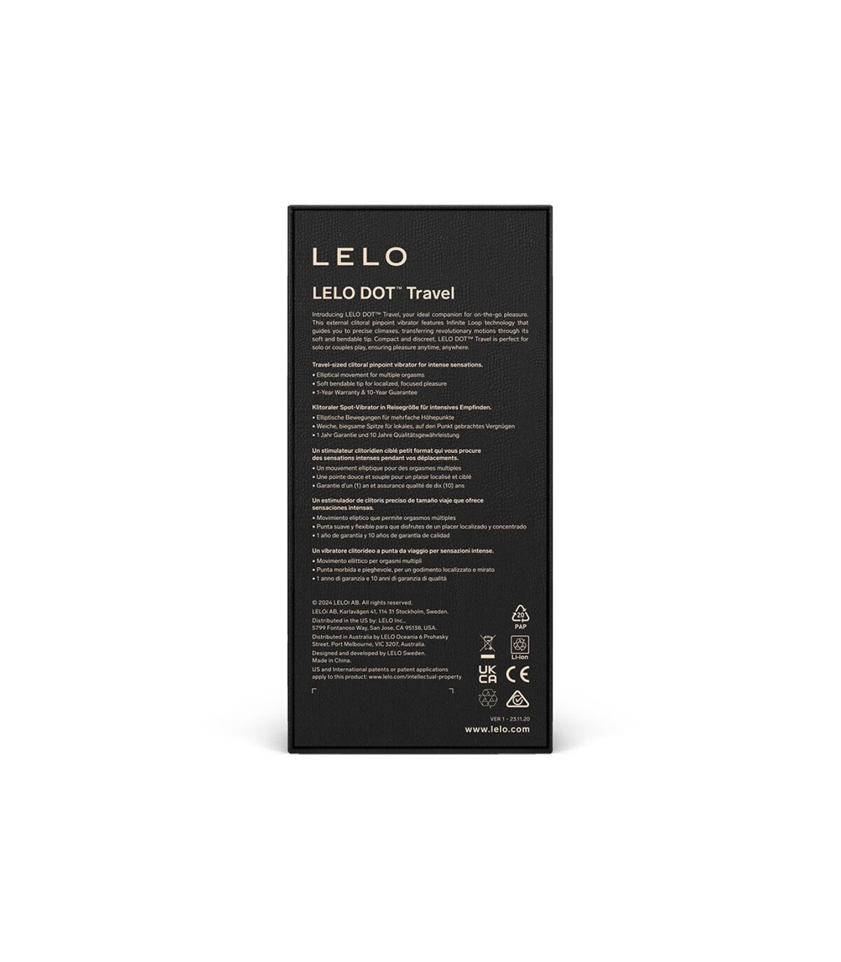 LELO DOT™ Travel es un discreto estimulador de clítoris preciso perfecto para llevarte a cualquier viaje, ya que cabe en cualquier maleta o bolso gracias a su nuevo tamaño reducido. Cuenta con ocho potentes modos de vibración con distintas intensidades. La tecnología Infinite Loop™ de LELO DOT™ Travel te permite personalizar la experiencia orgásmica cambiando de posición su punta suave y flexible.