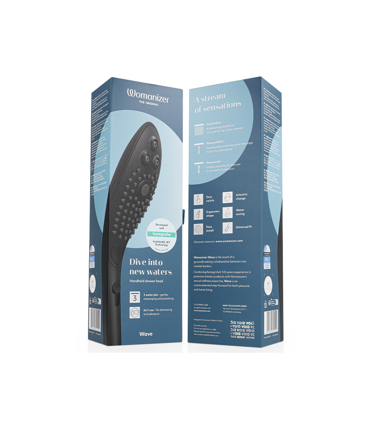 Los modos PleasureJet y PleasureWhirl estimulan el clítoris, mientras que el modo PowderRain proporciona una ducha de lujo. Todos los ajustes han sido perfeccionados por los fabricantes de baños líderes del mercado, hansgrohe, para un rendimiento óptimo. Wave puede usarse como un cabezal de ducha normal o como un juguete sexual. Discreto y elegante, Wave funciona como un cabezal de ducha de alta calidad y, al mismo tiempo, proporciona orgasmos excepcionales.