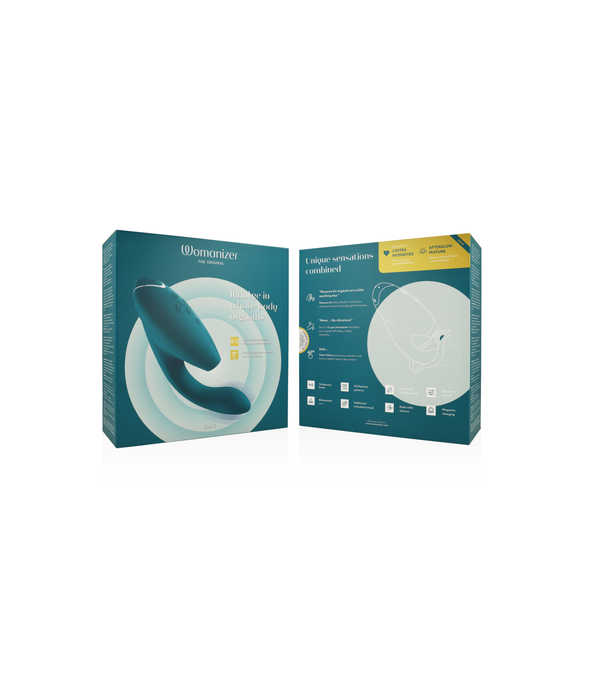 Las vibraciones y las pulsaciones del aire se controlan por separado y de forma sencilla mediante botones suaves al tacto en la parte superior del cabezal del estimulador. Con el modo Smart Silent, el DUO 2 solo se encenderá cuando esté en contacto directo con tu piel, manteniendo aún más silenciosos los ya silenciosos ruidos.  Con la función Afterglow, presione el botón de encendido brevemente después del clímax, bajando la intensidad del DUO 2 al nivel 3 para un final relajante. ¡Hecho con silicona segura para niños, el DUO 2 es resistente al agua para que puedas extender el tiempo de juego en el baño o la ducha!  Utiliza siempre un lubricante a base de agua con el DUO 2 y recuerda limpiarlo con un limpiador de juguetes antes y después de cada uso.  ¡Lleva tus orgasmos al siguiente nivel con el estimulador dual Womanizer DUO 2!