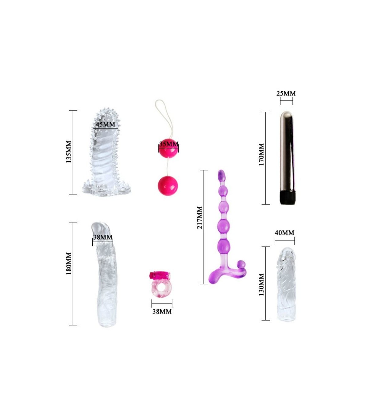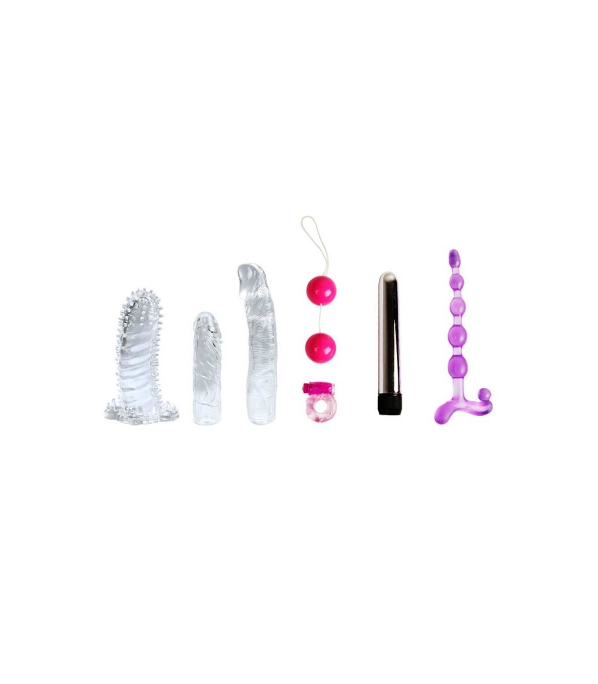 Su vibrador plateado con sus fundas te satisfacerá profundamente, prueba su dildo translúcido para conseguir diversión real. Coloca el anillo para el pene texturado sobre tu pena y rozalo con el clítoris de tu pareja para que disfrute al ritmo de sus vibraciones. La cadena anal graduada os proporcionará una diversión diferente para que puedas experimentar tanto analmente como de forma vaginal.