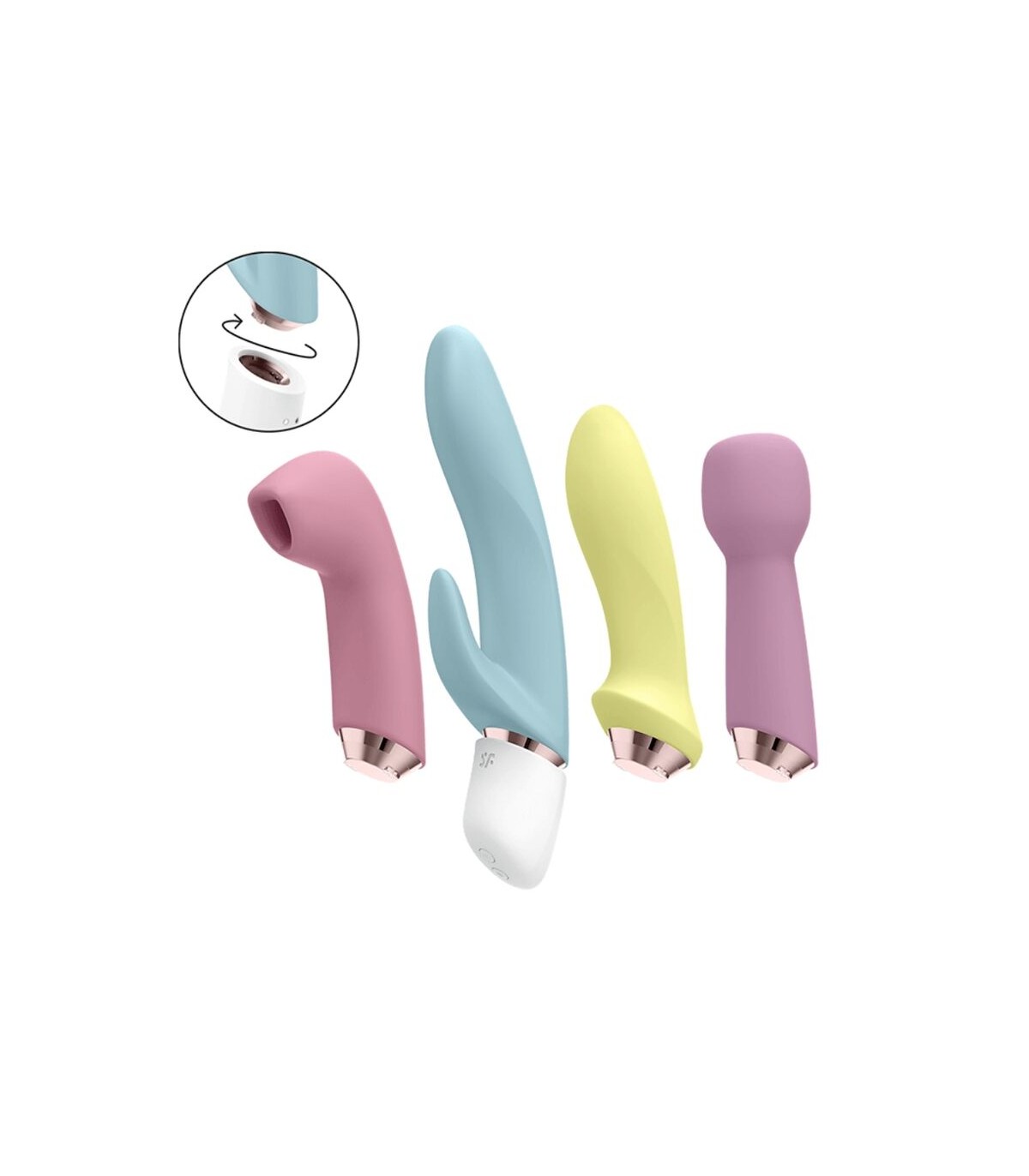 ¿Por qué solo un amante cuando puedes tener 4? Descubra la máxima versatilidad y descubra 4 de nuestros bestsellers absolutos. Las bases de los juguetes de silicona son intercambiables y se pueden colocar fácilmente en la base con un movimiento de clic y rotación de 90°. Para que puedas elegir fácilmente qué amante quieres: incluye un vibrador de ondas de presión clásico, un vibrador rabbit, un masajeador y un estimulador anal. Puede elegir fácilmente entre los programas usando los botones +/- en la parte frontal de la base.