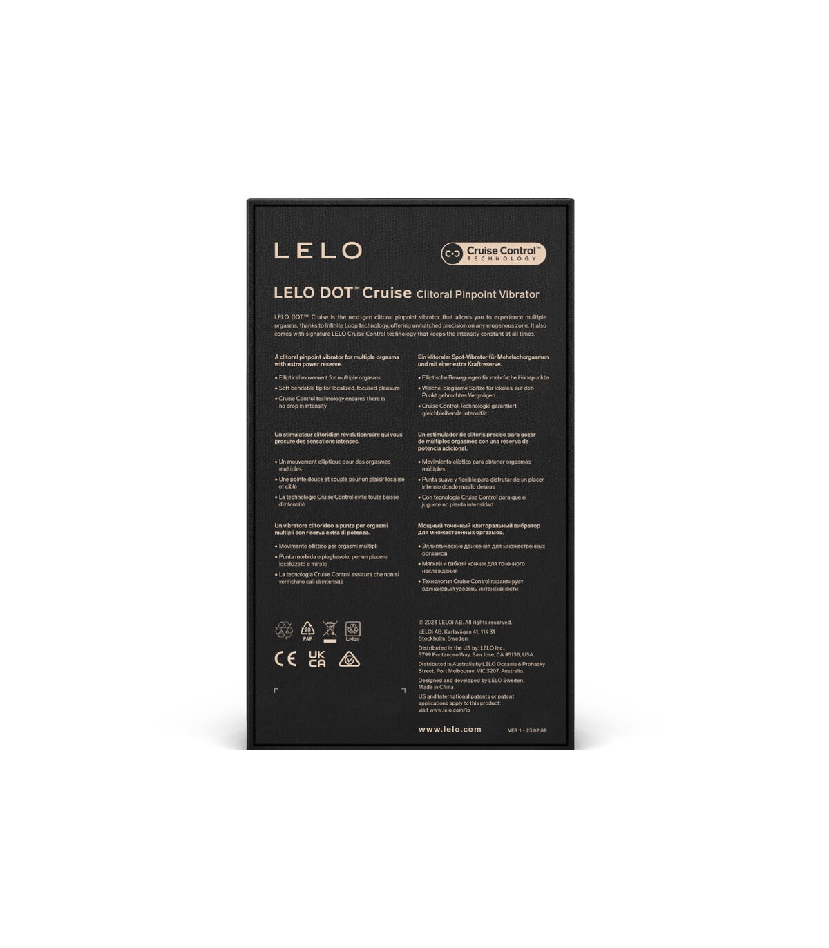 del juguete para ofrecer una estimulación sin igual y con absoluta precisión en el clítoris y cualquier zona erógena externa. Pero lo que diferencia a LELO DOT Cruise de la generación anterior es la introducción de la tecnología patentada Cruise Control. Gracias a ella, todas aquellas personas que quieran experimentar múltiples sensaciones pueden buscarlas usando los distintos modos de placer y su intensidad constante.
