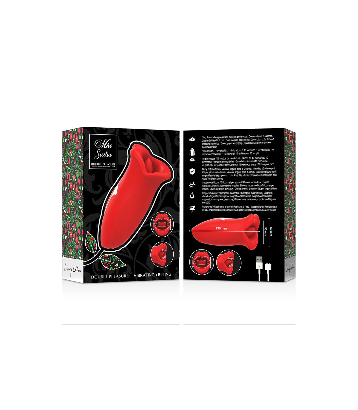 MIA SICILIA™ posee diez patrones de vibración con distintas intensidades que van desde un suave murmullo a pulsos muy excitantes. Otros 10 modos de movimiento lengua que alcanza el climax de dioses.