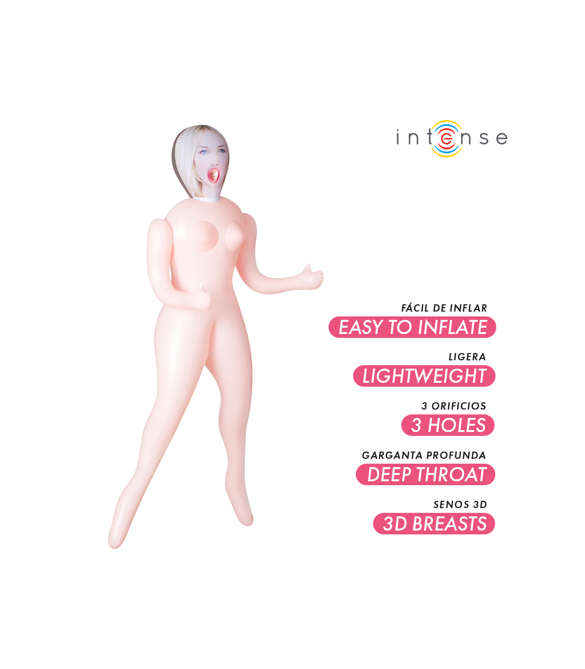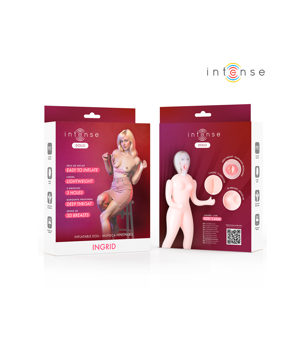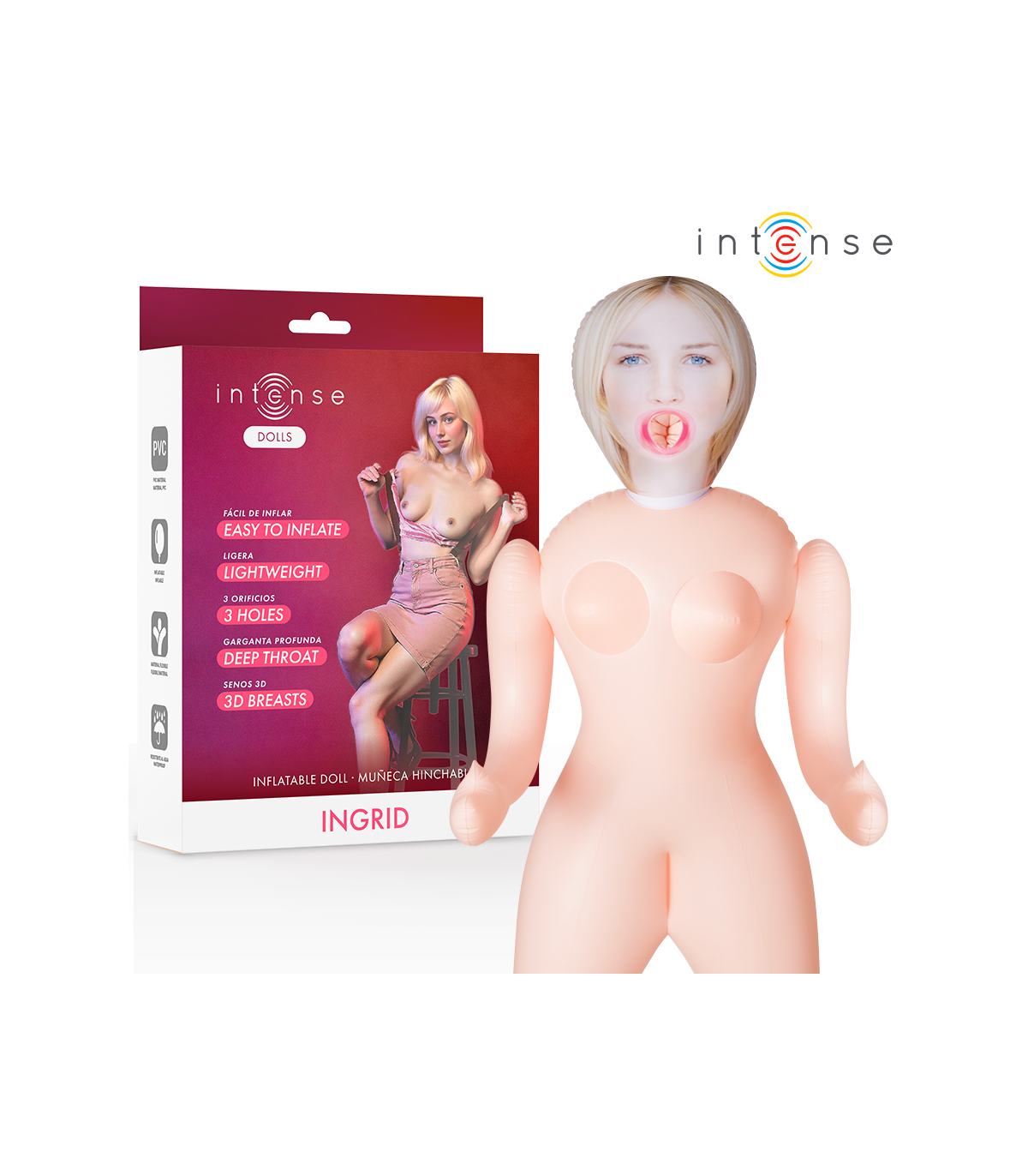 Descubre el placer sin límites con Ingrid, la muñeca hinchable de Intense Dolls que combina realismo, comodidad y diversión en un diseño ligero y fácil de usar. Con sus tres orificios funcionales y sus senos 3D realistas, ofrece una experiencia sensual completa para disfrutar en solitario o en pareja.