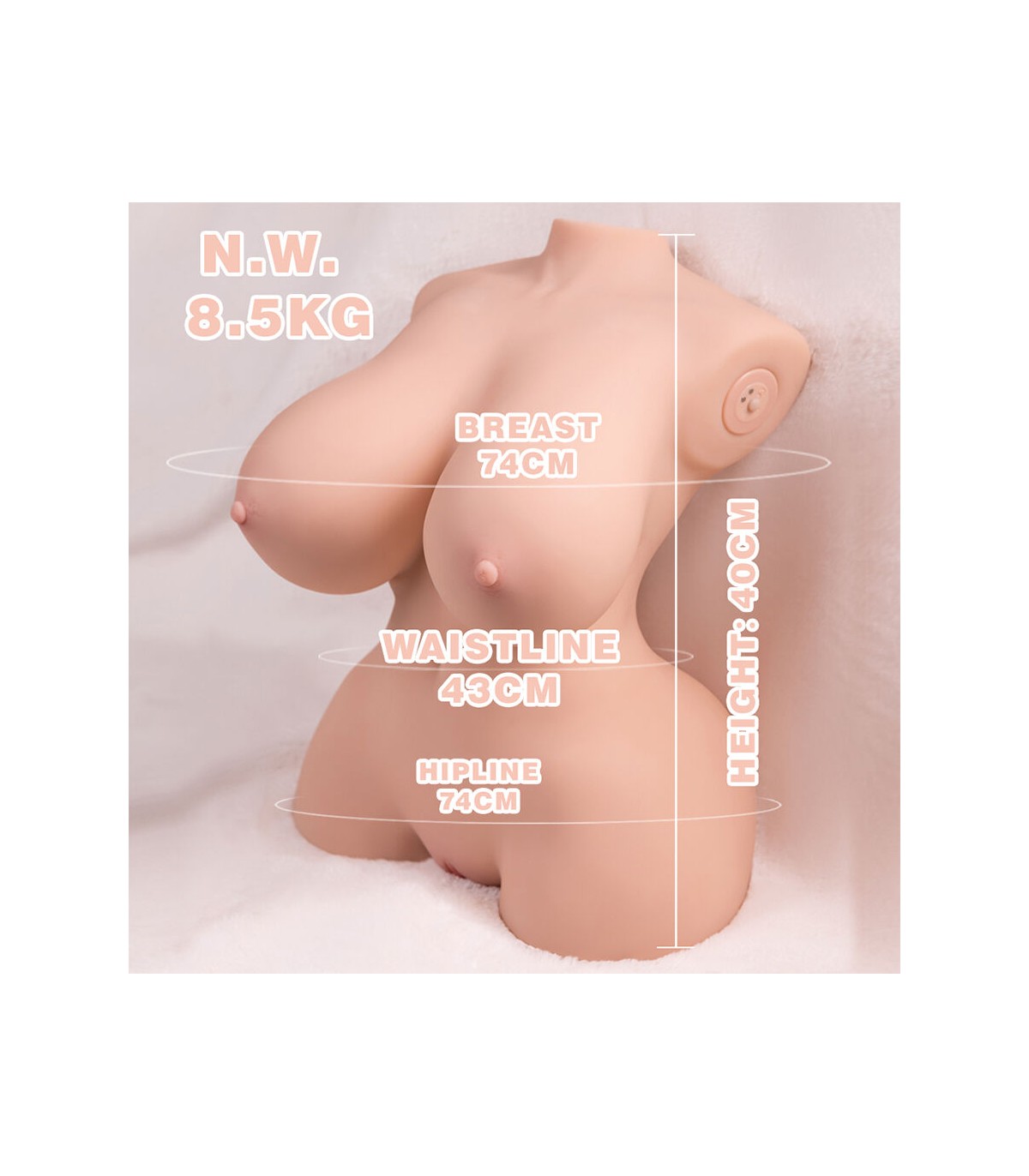 - Diseño hiperrealista con detalles anatómicos: Este torso ha sido diseñado para replicar fielmente el aspecto y la sensación del cuerpo femenino. Su estructura incluye: Senos moldeables y suaves, que brindan una experiencia táctil placentera. Cintura definida y curvas naturales, proporcionando una apariencia realista. Labios vaginales detallados y una entrada anal realista, con texturas internas diseñadas para una estimulación auténtica.