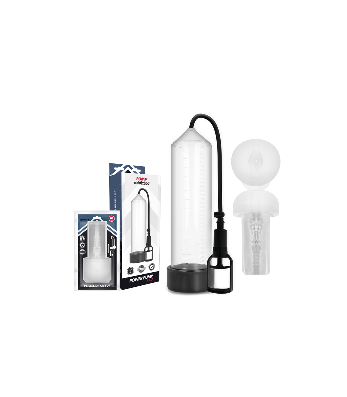 Además, todos los productos Pump pueden ser combinados con el lanzamiento de Pump vibrating bullet para aumentar la sensación de placer. Por si fuera poco, también puede ser combinado con algunos modelos de la serie Pump la manga masturbadora pleasure sleeve, disponible en dos tamaños, este fabuloso accesorio convierte a tu Pump Addicted favorito en un masturbador, pero por si fuera poco al hacer el vacío el tamaño del pene se multiplica por 5 visualmente un efecto óptico realmente atractivo cuando utilizas Pump.
