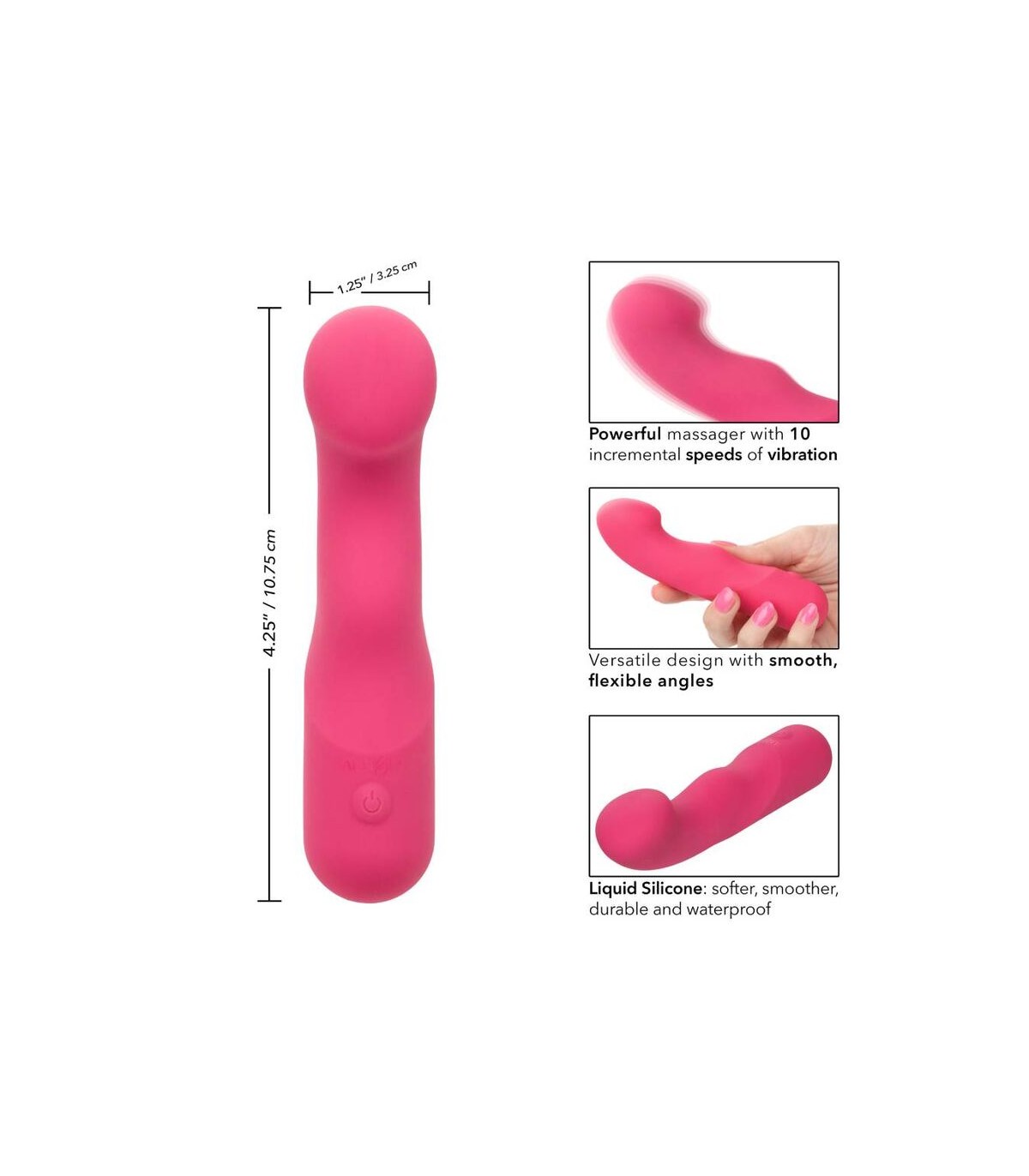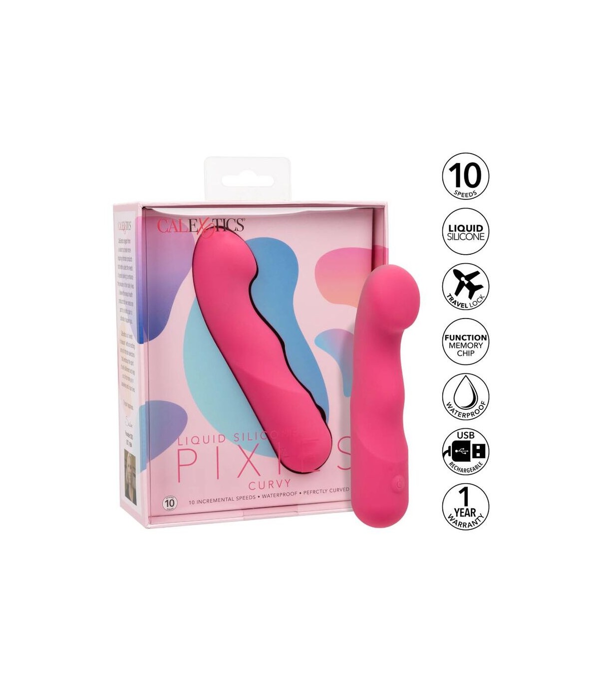El Curvy Liquid Silicone Pixies está diseñado para ofrecer una sensación de sacudida de rodilla a sus puntos de placer favoritos. La punta en ángulo flexible, el diseño de doble cara y las 10 velocidades emocionantes de vibraciones hacen que este sea el compañero de viaje perfecto. El masajeador curvo se ajusta en su mano para permitirle entregar tentalización precisa y emocionar con vibraciones contorneadas. Obtenga juguetón con cada aumento de las 10 velocidades incrementales de vibración con el botón de control de fácil toque. Control sin esfuerzo El placer puro con un botón de silicona de fácil toque y mantenga presionada durante 3 segundos para encenderse o desactivarse. La silicona líquida ultra-plush y la punta única flexible son excelentes para explorar puntos dulces sensuales y puntos de placer íntimos con facilidad. Con una forma suave y una superficie flexible, podrá disfrutar de vibraciones emocionantes desde cualquier ángulo que desee. Use el control suave de un solo botón para disfrutar de hasta 110 minutos de placer vibrante. Cargue su pasión en solo 1,5 horas conectando el cable USB proporcionado al puerto de carga de auto-selección en la base del masajeador. El tamaño discreto del masajeador delgado lo convierte en el compañero de viaje perfecto, lo que te permite adoptar el placer radiante donde te lleven tus fantasías. 10 velocidades incrementales de vibración