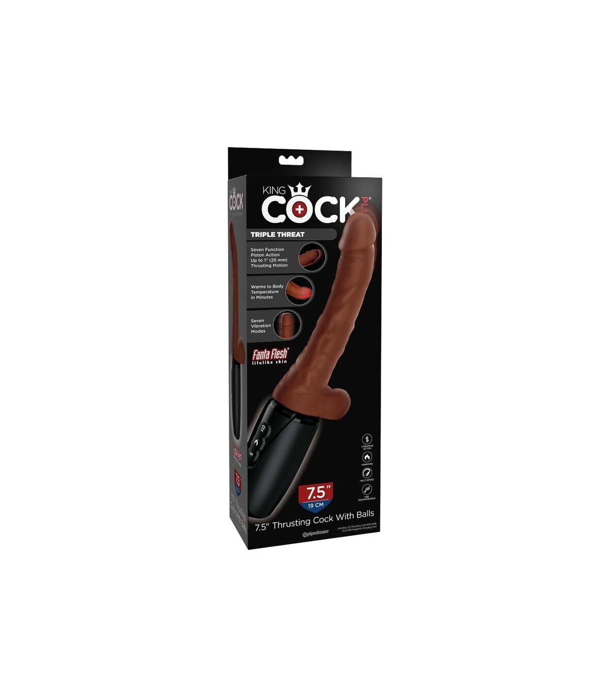 • Modo de calentamiento interno: El King Cock Plus Thrusting Cock tiene una función de calentamiento que eleva el exterior de Fanta Flesh a la temperatura corporal en cuestión de minutos.