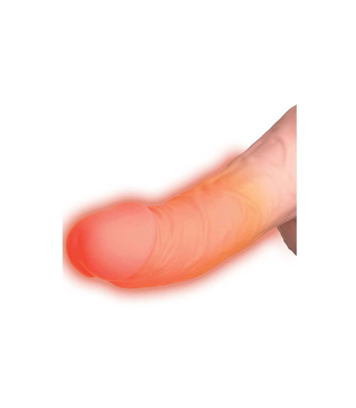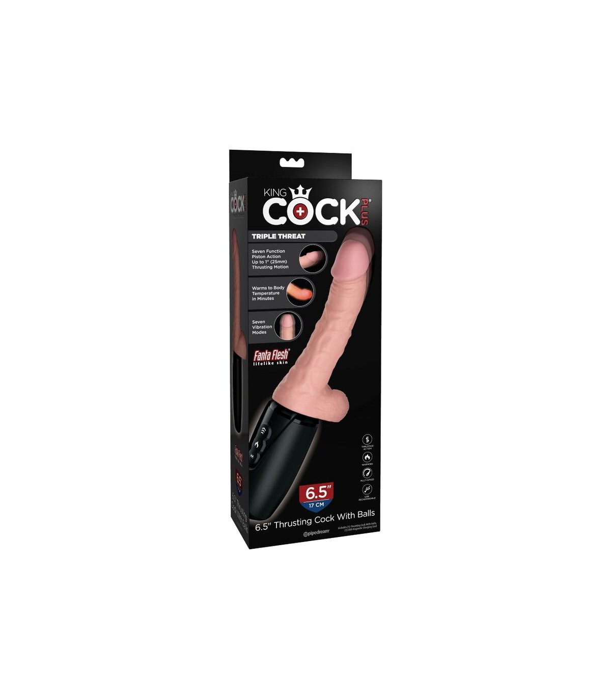 ¡Siente la diferencia! El King Cock Plus Thrusting Cock With Balls es realmente una triple amenaza que cuenta con un movimiento de empuje impulsado por un enorme motor, calentamiento interno hasta la temperatura corporal en minutos y poderosas vibraciones estimulantes para la mejor experiencia.