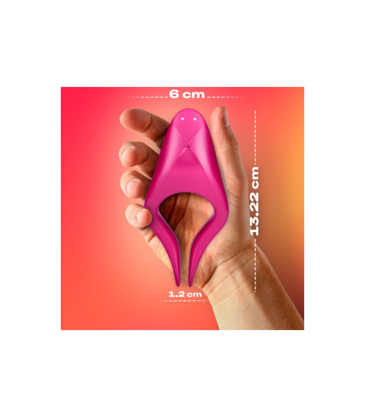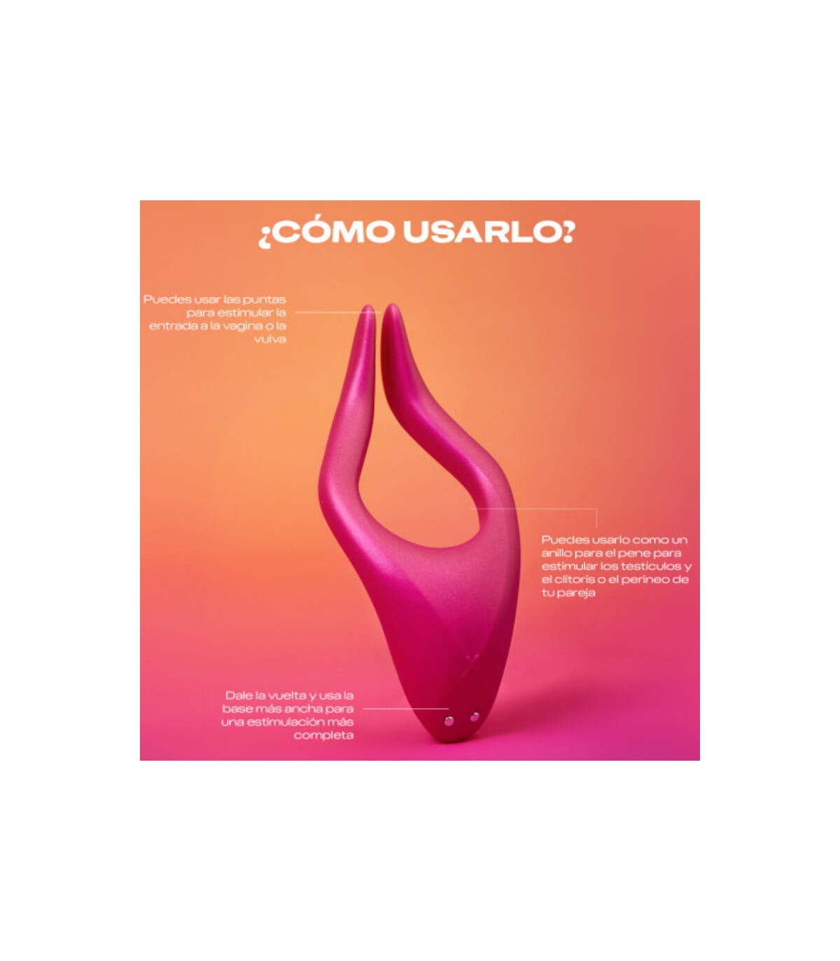 También puedes usar las puntas para estimular la entrada a la vagina o vulva. O dale la vuelta y usa la base más ancha para una estimulación más completa, para disfrutar de las oleadas de placer. Alternativamente úsalo como un anillo para el pene para estimular los testículos y el clítoris o el perineo de tu pareja. La base ancha puede venir por encima o por debajo, pero puedes girarla como quieras.