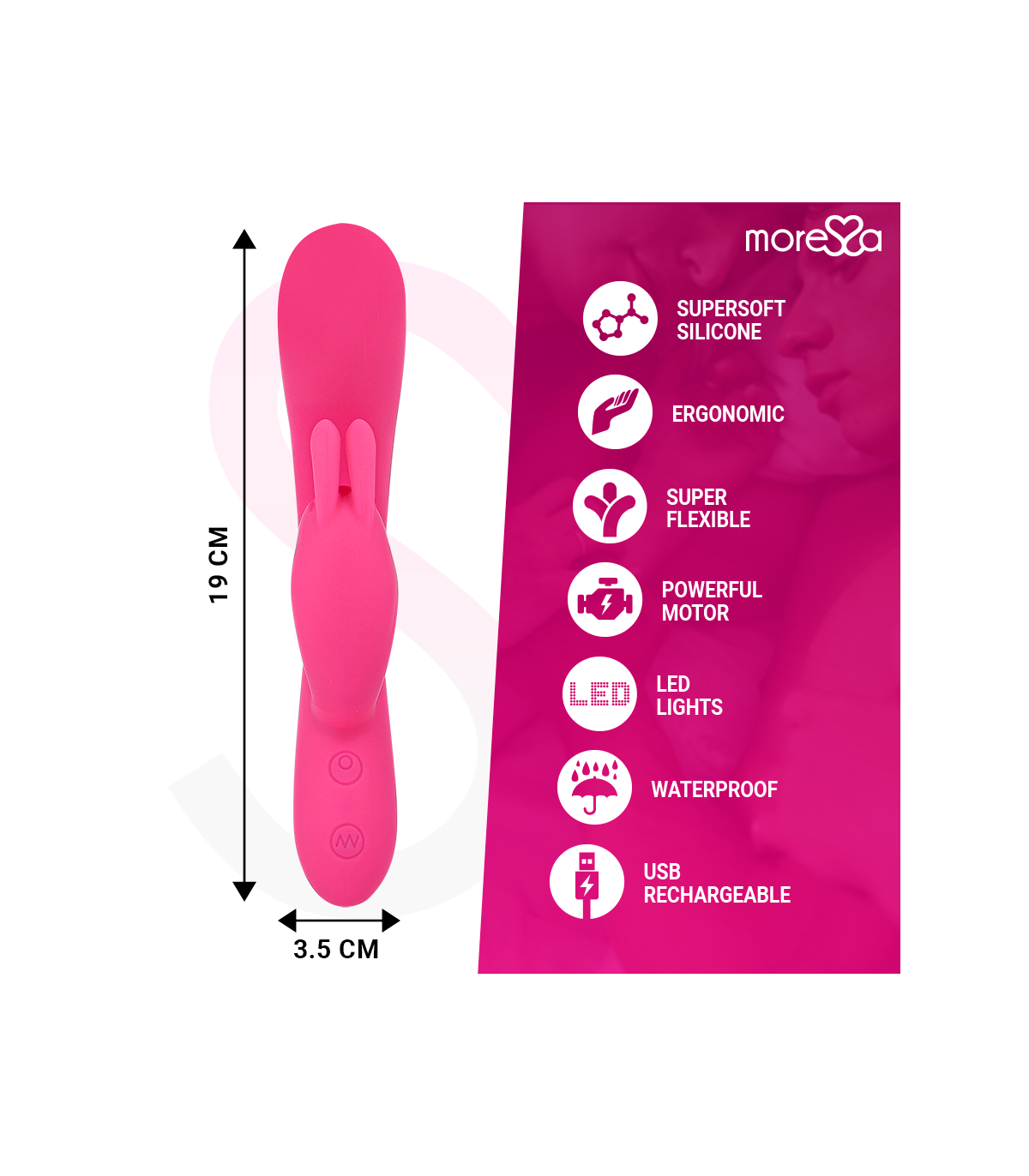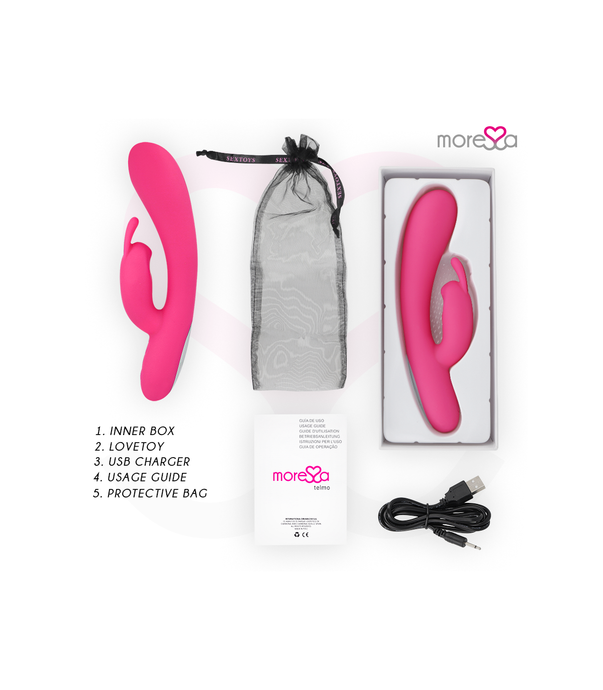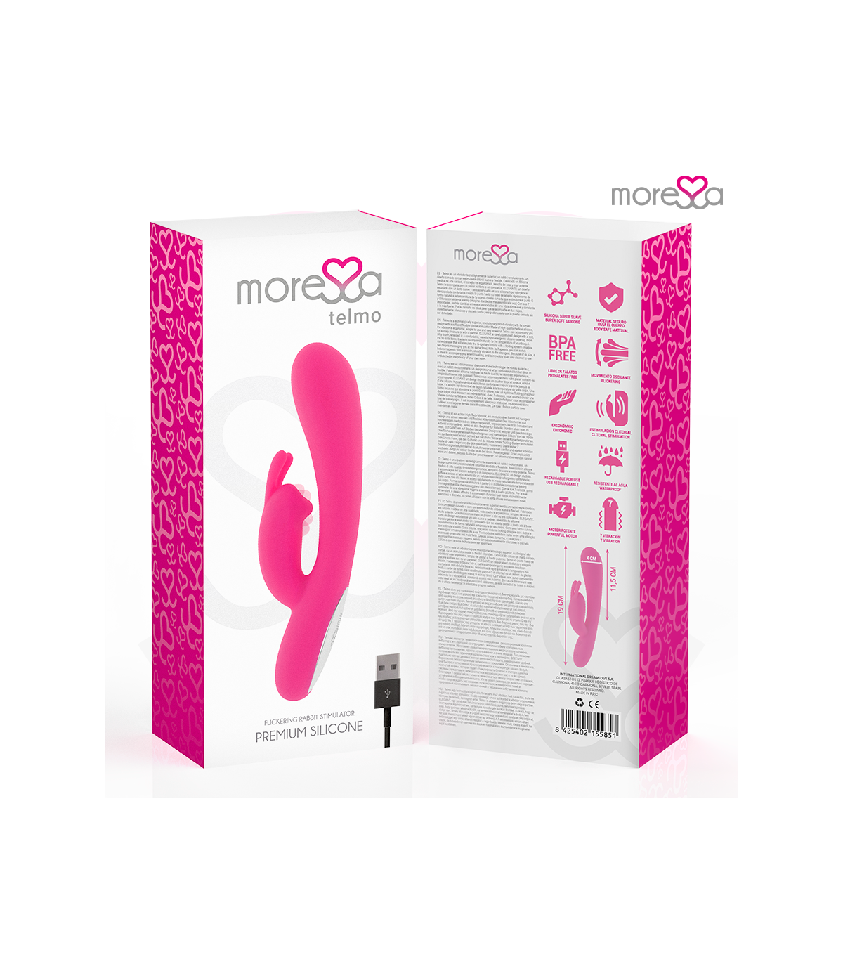 en el orificio de conexión de carga. Enchufar a la corriente con un conector o al ordenador mediante USB.Moressa es la marca referente por su diseño, calidad y tecnología. Hemos desarrollado un producto innovador y mimado cada proceso de fabricación para conseguir el mejor resultado.Moressa es símbolo de energía, fuerza y garantía. Comprar un Sextoy Moressa es sentirse reflejado con la actualidad. Cada Juguete Moressa te transportara a diferentes sensaciones. Un resultado inigualable gracias a la silicona Premium confortable y los diseños ergonómicos.