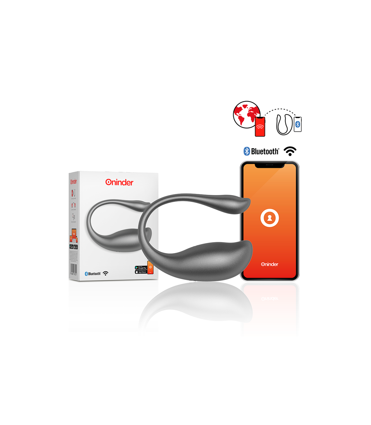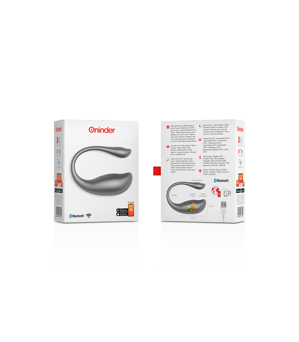 Con este vibrador no solamente puedes elegir entre combinaciones de intensidad y vibraciones preestablecidas, sino que también puedes compartir a un innovador control basado en una aplicación. Simplemente tienes que descargar la aplicación gratuita ONINDER en tu dispositivo Android o iOS y conectar tu smartphone o Tablet.