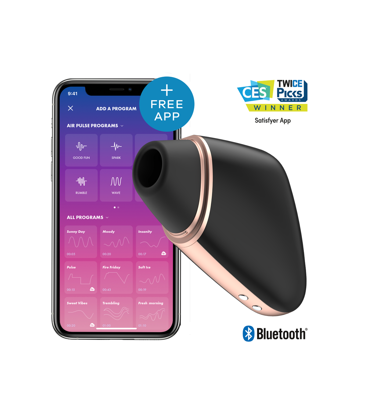 No debe perderse esto: ¡la nueva aplicación Satisfyer Connect le ofrece oportunidades únicas! Es compatible con cualquier teléfono inteligente, tableta Android o Apple y Apple Watch. Y lo mejor de todo: es gratis para usted y le esperan funciones nuevas y emocionantes cada mes. No es de extrañar que la aplicación Satisfyer Connect haya sido honrada en la feria de electrónica de consumo más grande del mundo CES en Las Vegas.