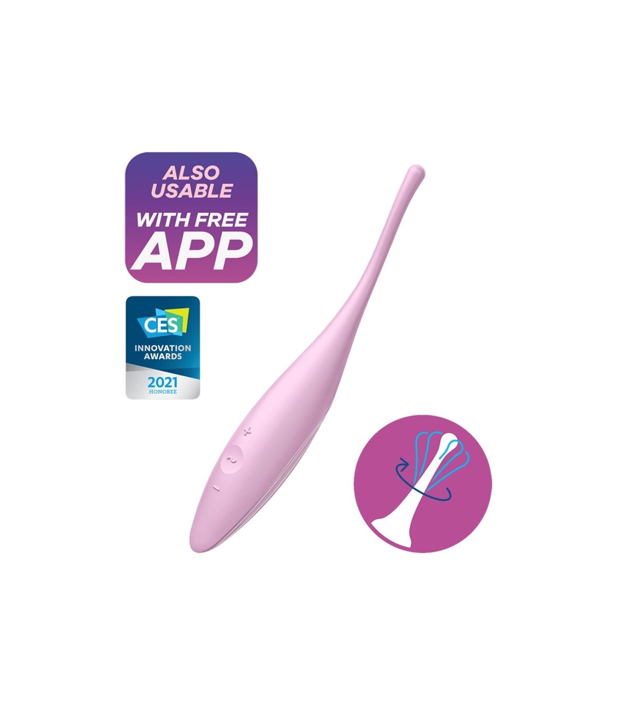 Con vibraciones circulantes, Satisfyer Twirling Joy de silicona estimula todas las zonas erógenas, como el clítoris, los labios o los pezones. Las vibraciones se pueden controlar mediante el panel de control o con la aplicación Satisfyer
