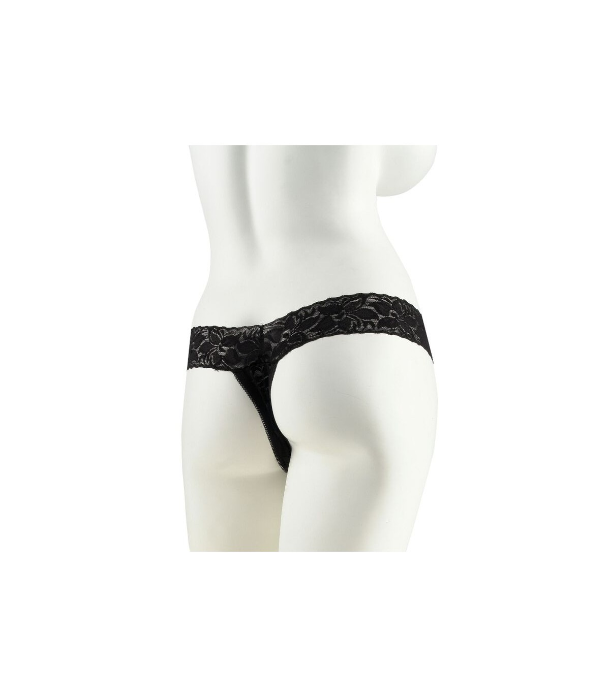 ¿Puedes guardar un secreto? Guardado discretamente dentro de este sexy tanga de encaje de cintura baja se esconde una mini bala vibradora diseñada para hacer temblar tus piernas.
